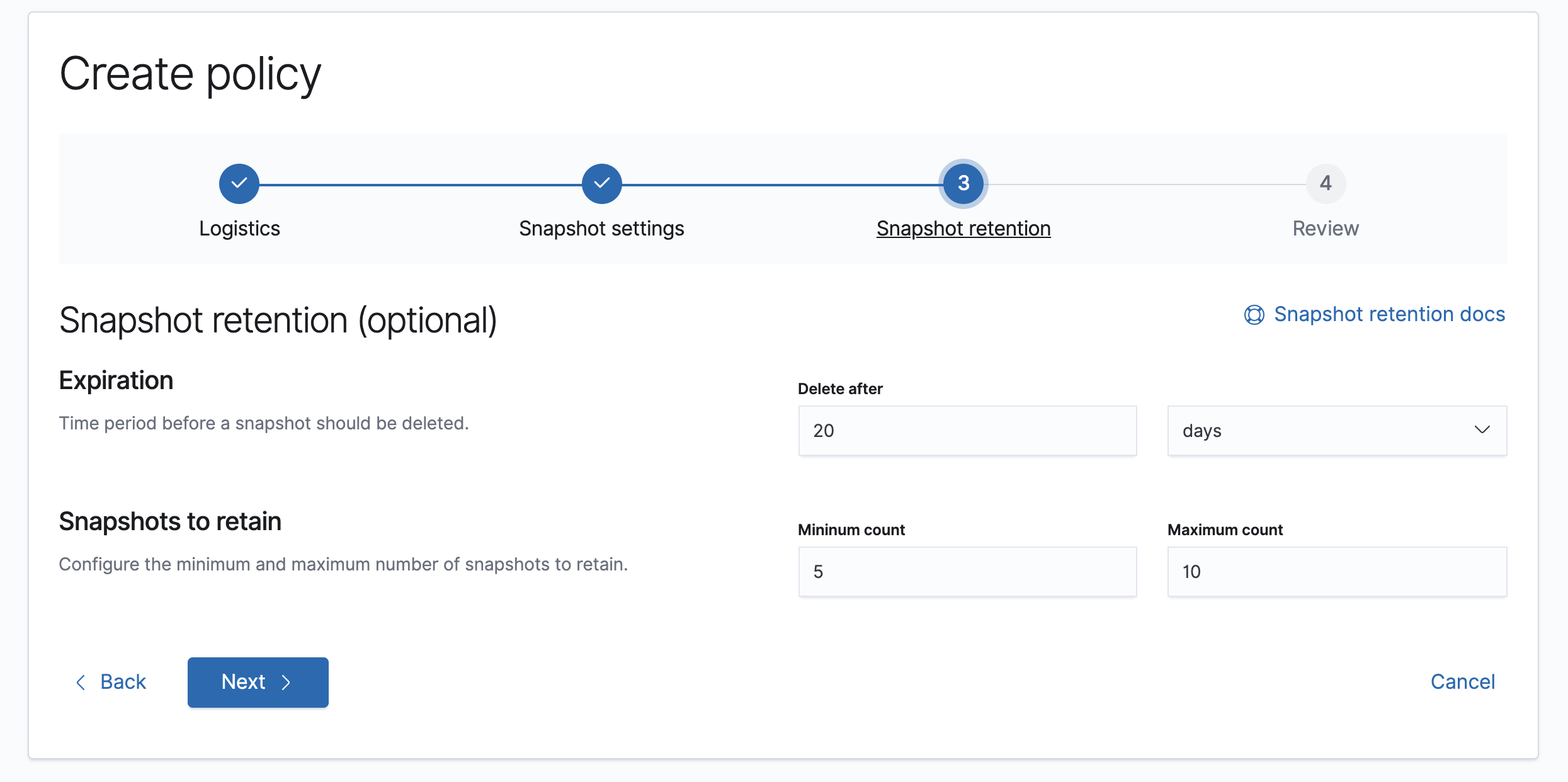 This PR adds the ability to configure snapshot retention as part of the create policy wizard.