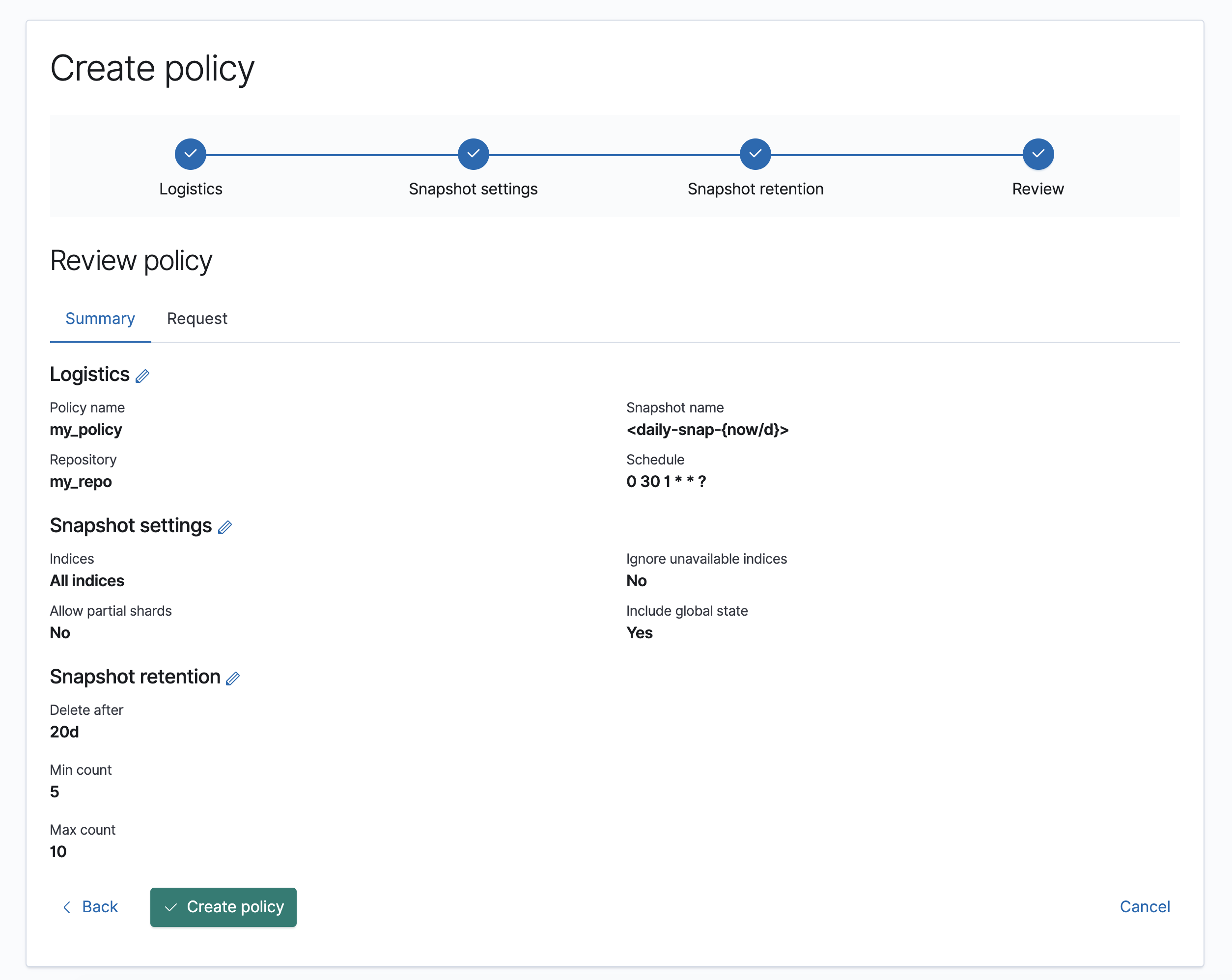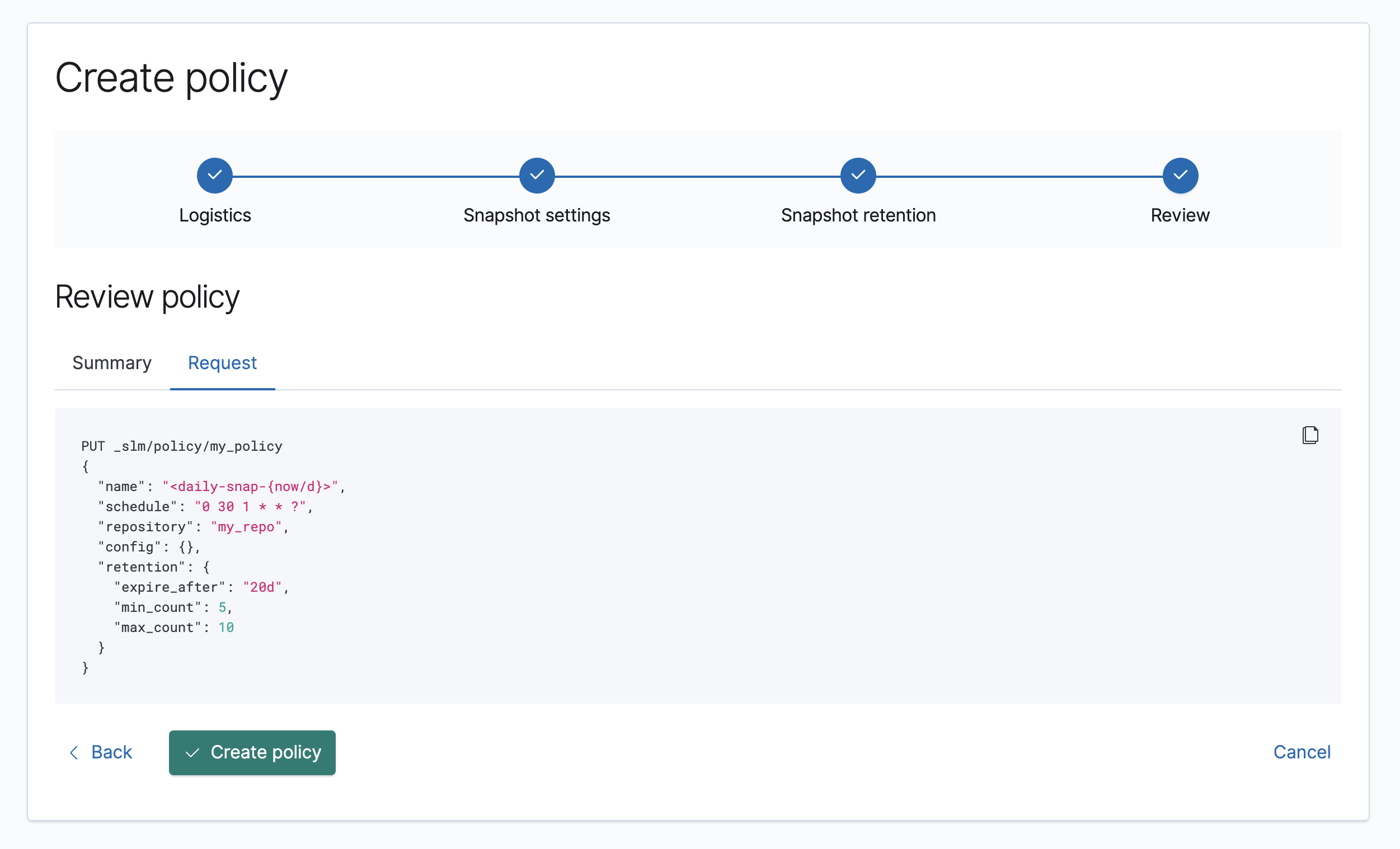 slm.retention_schedulecluster setting through the UI. Policy statistics were also added to the policy details panel.Testing locally