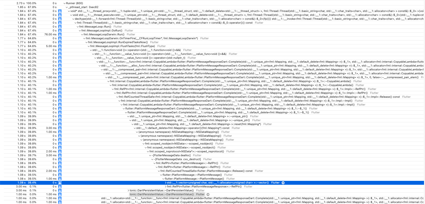 @stuartmorgan @xster I was trying to figure out how platform channels work completely. When looking into it I saw we were doing an extra copy of the data to get NSData's for passing to the user. This PR removes two of those extra copies. We've had some users complain about the performance of sending large buffers so this will help with that (@xster do we have an issue open for that?). This technically could be slower if the buffers are small since it has an extra allocation and one layer of indirection when accessing the bytes. We could get around that by selectively copying if the buffers are small. We'd have to do some microbenchmarks to get an idea about the math for that. While looking I've also found an opportunity to speed up android platform channels by using direct buffers. That sounds worthwhile, what do you think? We could also potentially remove the copies that are happening in CopyNSDataToVector and CopyNSDataToMapping if we transitioned away from using std::vector and instead used our own buffer wrapper that can do no-copy initializations and releases. That might be a bit more involved though. |