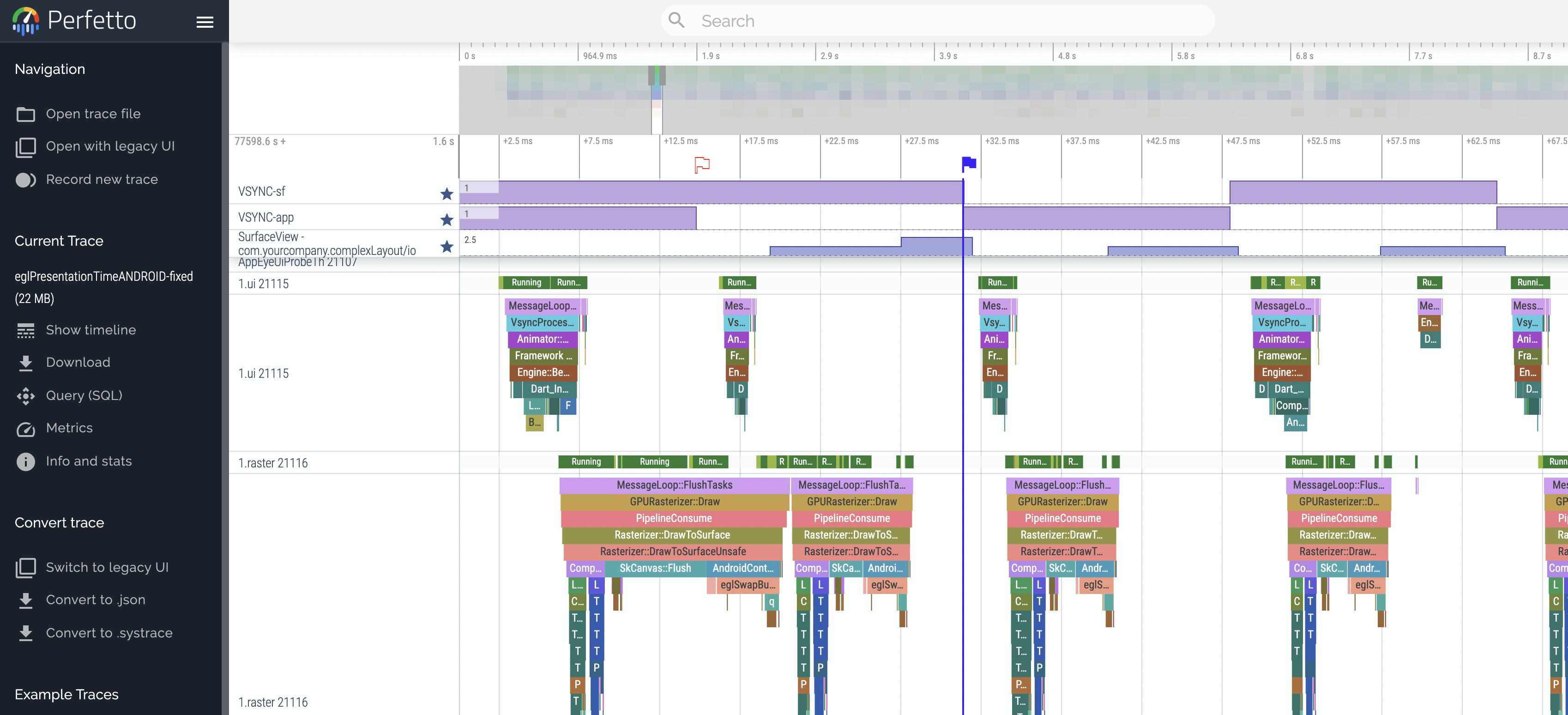 Can see trace also. Between the Red Flag to Blue Flag is one frame. In this frame raster commit 2 buffer to bufferQueue. These 2 buffer is used/discard in the next Vsync-sf (Blue Flag).