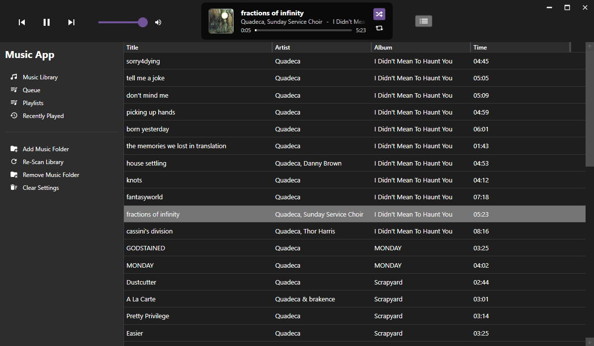 - Currently playing track viewport with working seek bar and song info. Clicking and dragging takes the user to the selected time.