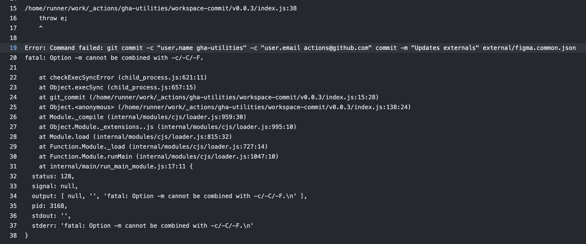 Error: Command failed: git commit -c "user.name gha-utilities" -c "user.email actions@github.com" commit -m "Updates externals" external/figma.common.json