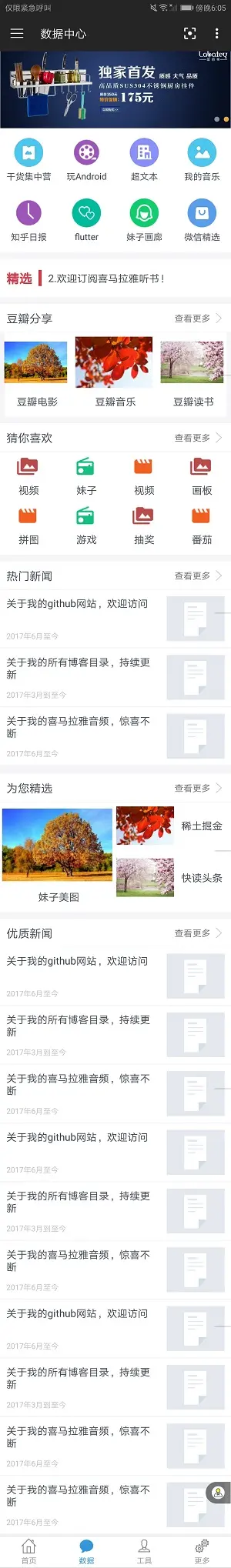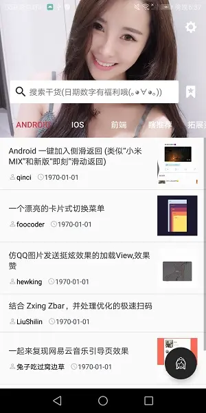 - 干货集中营:包含福利,搜索,每日技术新闻,休息视频等众多模块