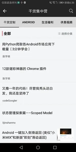 - 技术分享部分(鸿洋玩Android,还有代码家的干活集中营等等),关于flutter版本的极致体验玩Android客户端