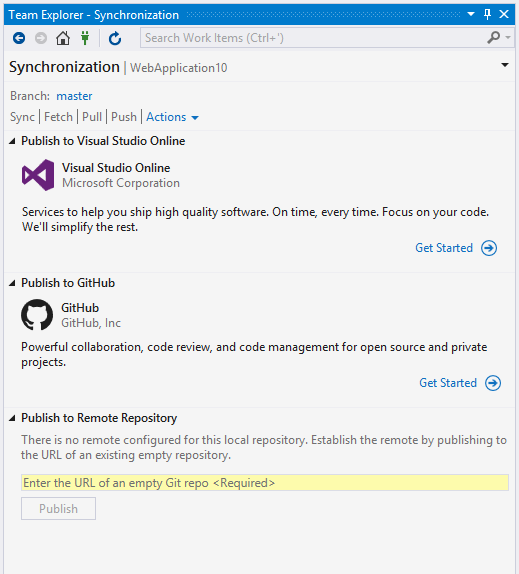 Here's how the Visual Studio sync dialog appears without the GitHub extension installed: