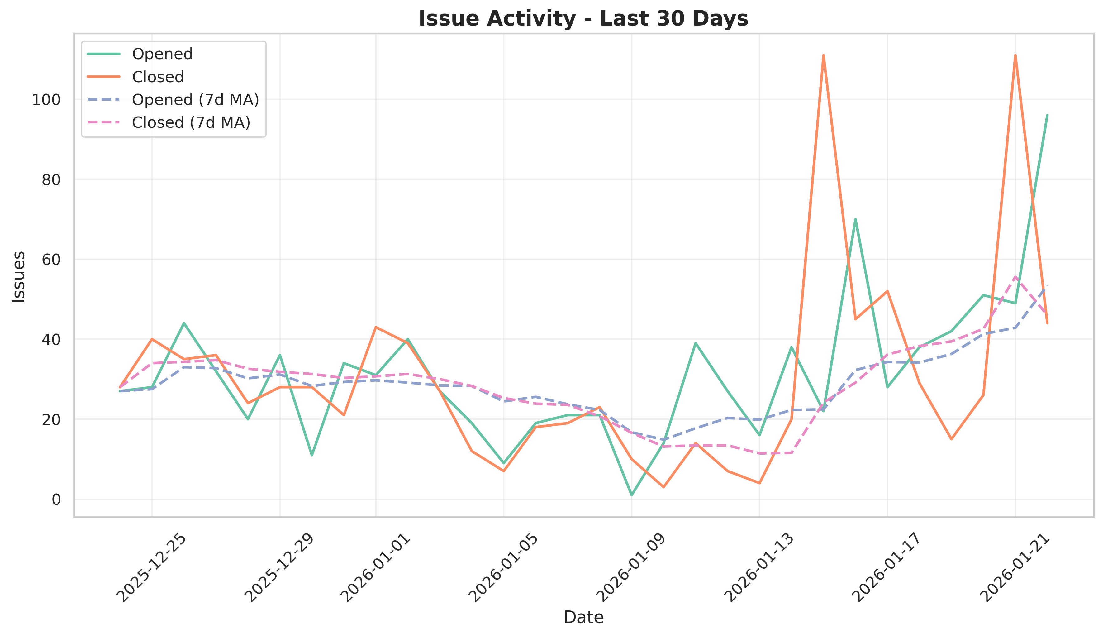 Opened and closed activity are both elevated across the last 30 days, with the 7-day moving averages staying close. This suggests the team is keeping pace with intake while maintaining a low open backlog.