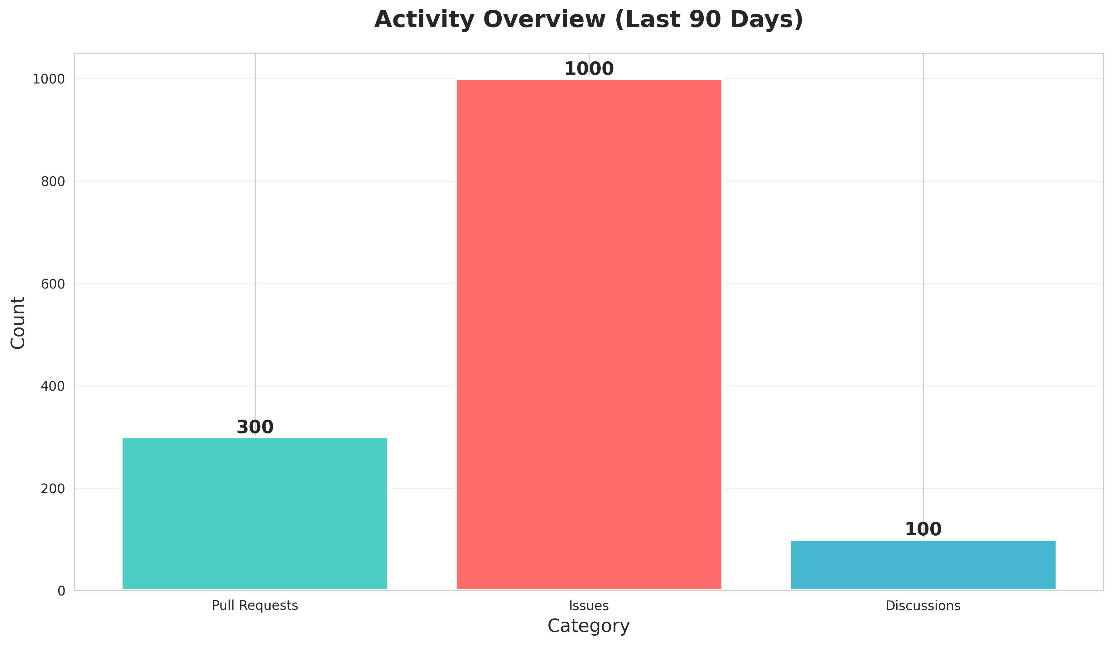 Activity volume is led by issues (1,000 sampled), followed by PRs (300 sampled) and discussions (100 sampled). The distribution reflects heavy automation and reporting workflows alongside ongoing development.