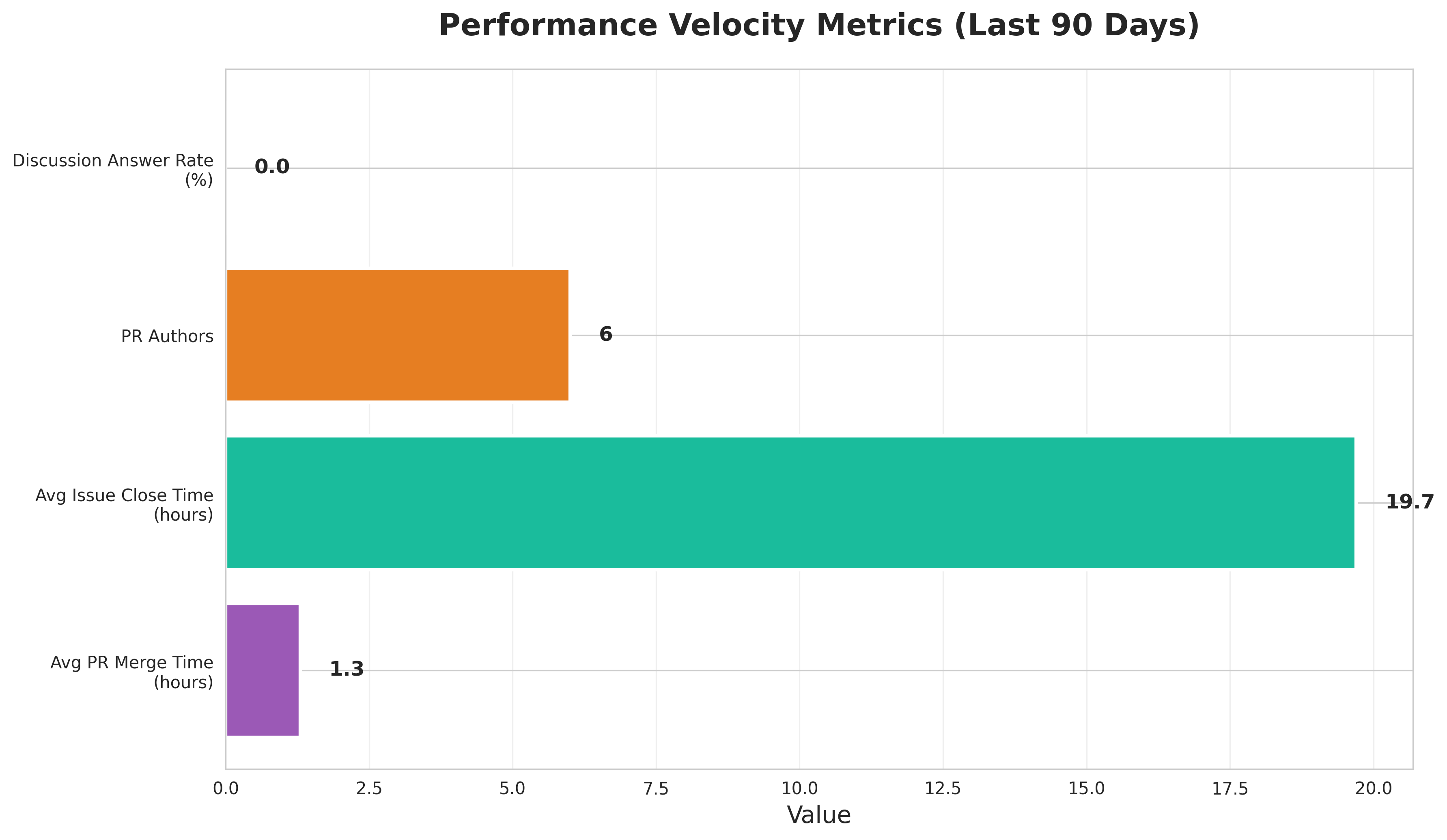 Average PR merge time is ~1.3 hours and average issue resolution is ~19.7 hours, signaling fast turnaround. Discussion answer rate is 0% in the sample, likely reflecting report-only discussions or unanswered Q&A.