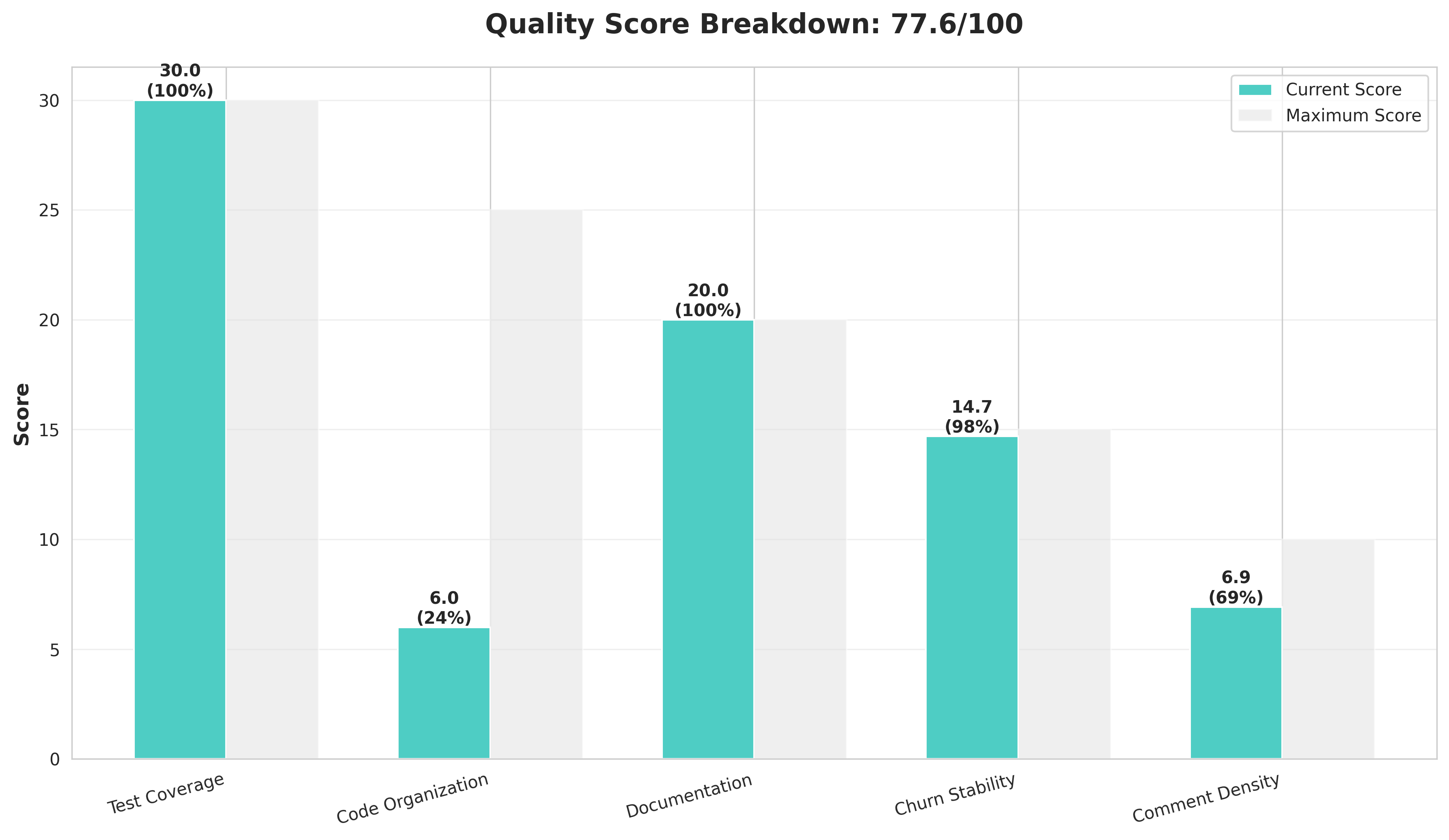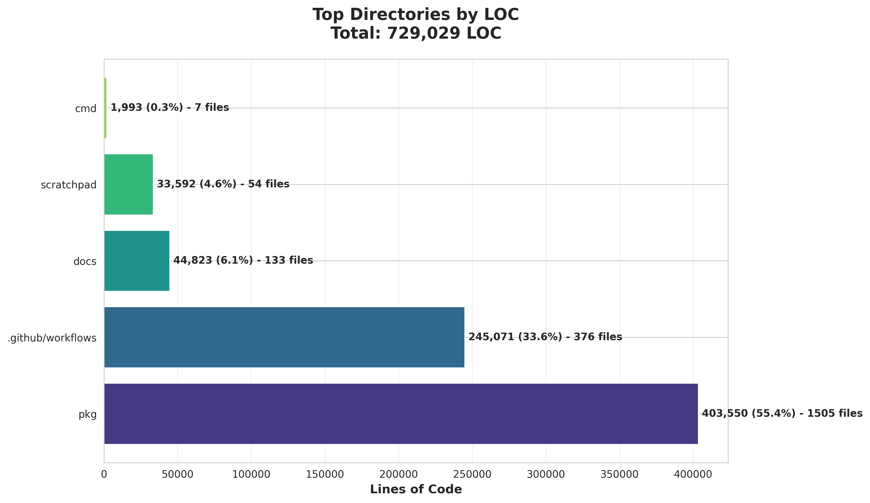 pkg/directory dominates with 403,550 LOC (55.5% of tracked directories), indicating a well-structured Go project following standard package organization. The.github/workflows/directory contains 245,071 LOC (33.7%), reflecting extensive CI/CD automation and workflow definitions. Documentation indocs/comprises 44,823 LOC (6.2%), demonstrating commitment to comprehensive documentation.Quality Score Breakdown