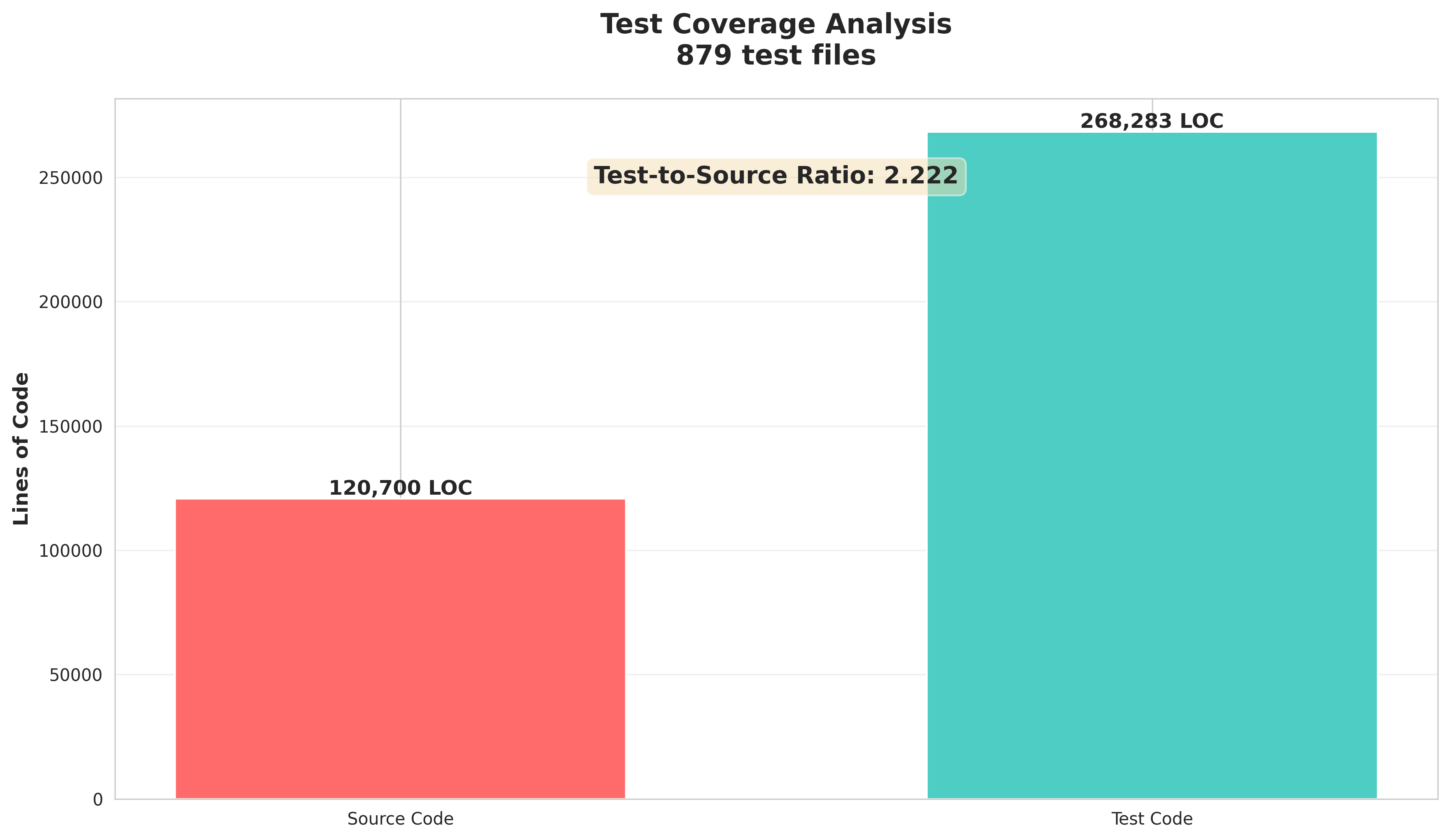 With 879 test files containing 268,283 lines of test code versus 120,700 lines of source code, this project demonstrates industry-leading test coverage. The 2.222 test-to-source ratio significantly exceeds typical recommendations (0.5-1.0), indicating thorough testing practices and strong commitment to code quality and reliability.