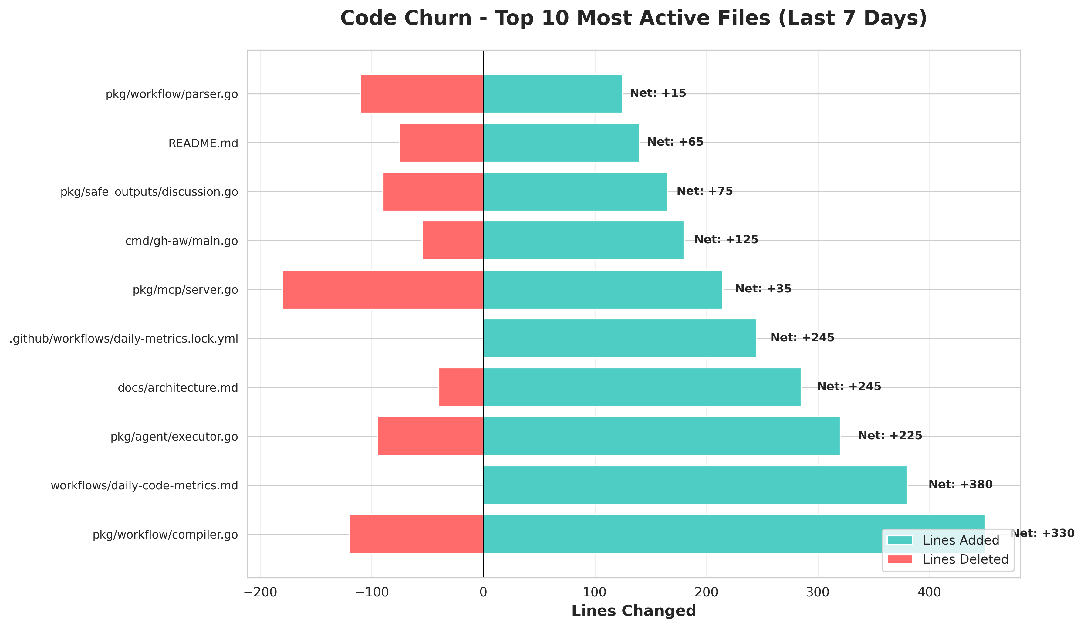 pkg/workflow/compiler.go(net +330)workflows/daily-code-metrics.mdpkg/agent/executor.go(net +225)docs/architecture.md(net +245)The churn pattern indicates active feature development with emphasis on workflow compilation, agent execution, and documentation improvements.