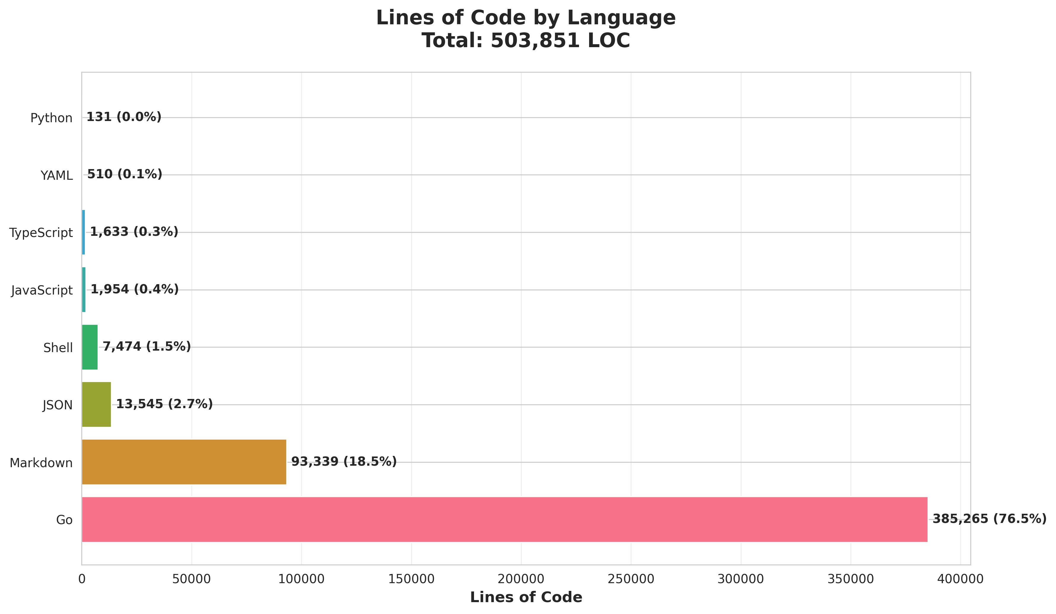 The codebase is predominantly Go (76.5%), followed by Markdown documentation (18.5%). This reflects a well-documented Go project with strong emphasis on both implementation and documentation. The small presence of TypeScript/JavaScript (0.7%) and Python (0.03%) suggests selective use of these languages for specific tooling or integration tasks.