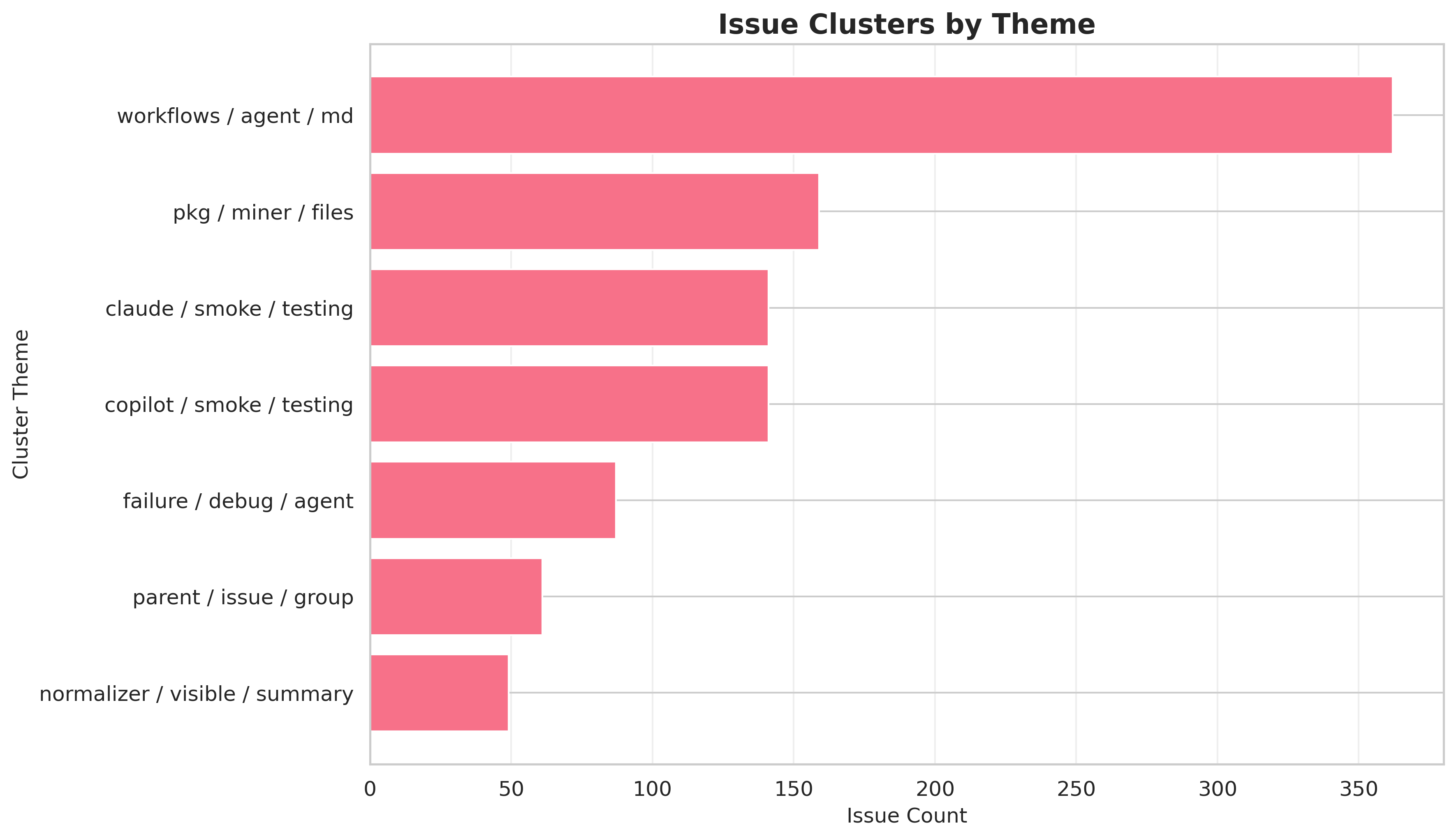 Workflow/agent markdown topics dominate the dataset, followed by task-mining activity and smoke-test-related clusters. Smaller clusters show grouping/parent issues and visibility normalizers.