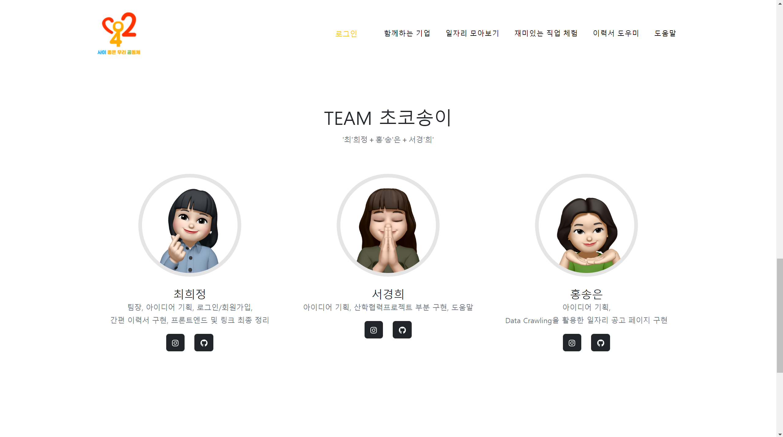 가운데의 더 알아보기 버튼을 누르면 사이공의 간략한 정보들을 확인할 수 있어요 페이지를 계속 내려가며 사이공이 어떤 서비스인지, 사이공이 제공하는 서비스에는 어떤 것들이 있는지 등을 간단히 파악할 수 있답니다 또한 사이트의 하단에는 사이공을 함께 기획한 팀원들의 정보가 담겨있어요