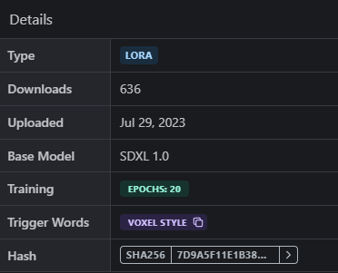 I tried with a few different LoRAs and never saw a difference, but I'll try again... Success with "voxel style": In some cases it helps to have the trigger term in the Style part of the prompt, and in other cases it doesn't matter. |