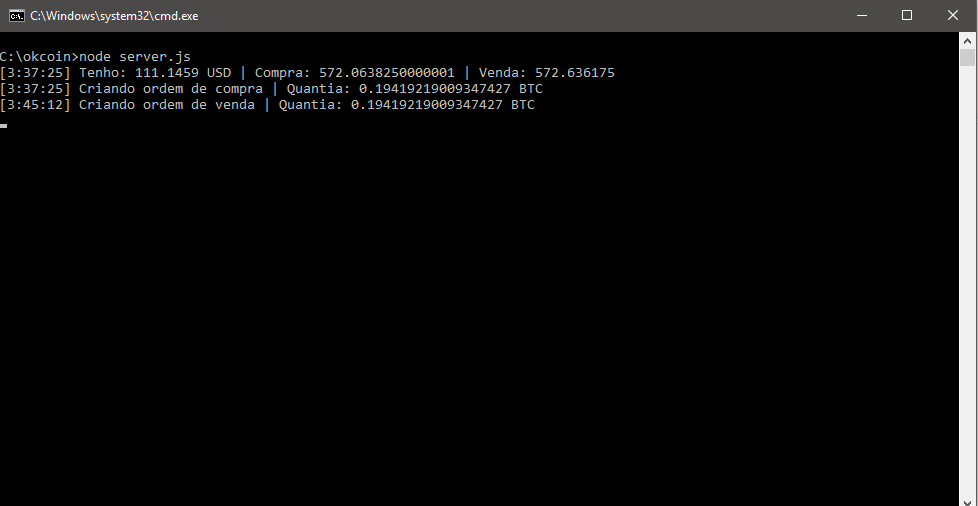 var apiSecret = 'SUA API SECRET';Outras configurações como margem de lucro, valor para trade. Devem ser modificadas em server.js diretamente no código. Que está todo comentado para fácil entendimento.