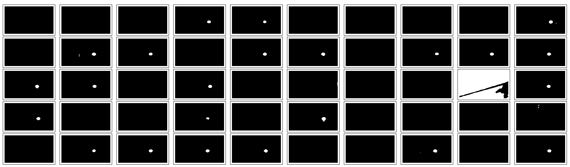 The first step in looking for the skull is to remove some noise from the image. A strategy that I found produced excellent results was to average the frame with the previous frame and the next frame. Keep in mind that the previous and next frames are actually 3 seconds apart, so they tend to be significantly different. We are exploiting the fact that we expect the score to not change very often, and this assumption generally holds true. This makes anything that did not remain constant between these 3 frames very blurry. Here's what this looks like for 50 random frames: