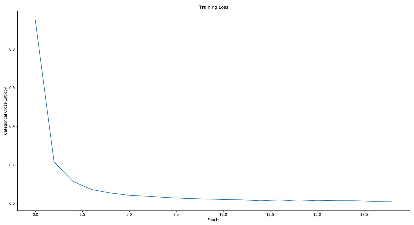 Here's a plot of the loss (categorical cross entropy) plotted over time during training. Evidently there is a plateau around the 13th epoch, which is how I decided to end the training at 13 epochs, to avoid overfitting.