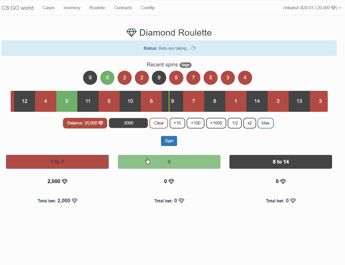 Website provides the opportunity to open CS:GO cases, play roulette and coinflip, make trade-up contracts, and a little bit more. Most of the available features will be described below. Frontend part is built fully with Vue.js almost half a year ago and needs some refactoring. Backend is on Laravel, but at the moment it also needs refactoring and will be attached later.