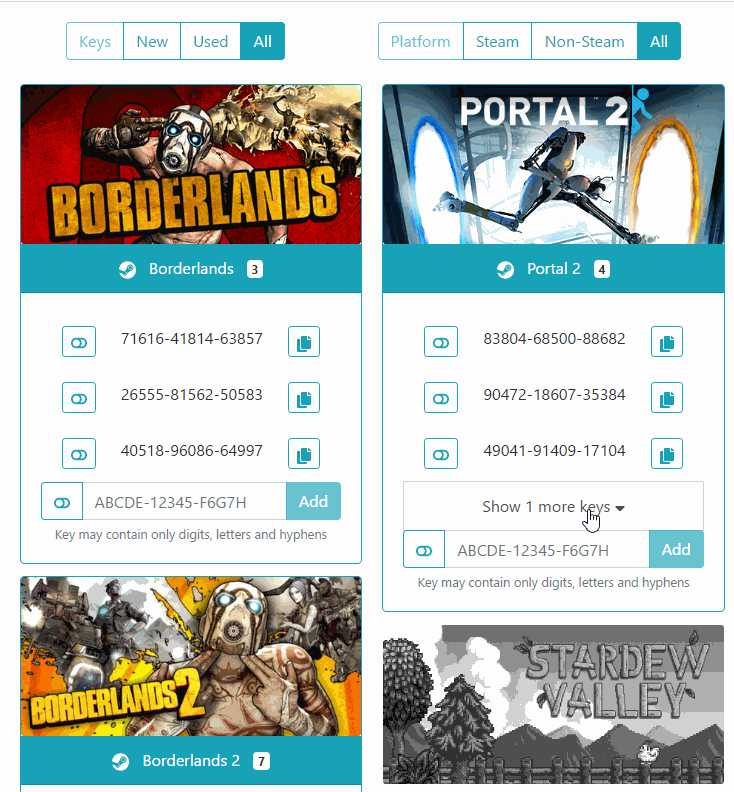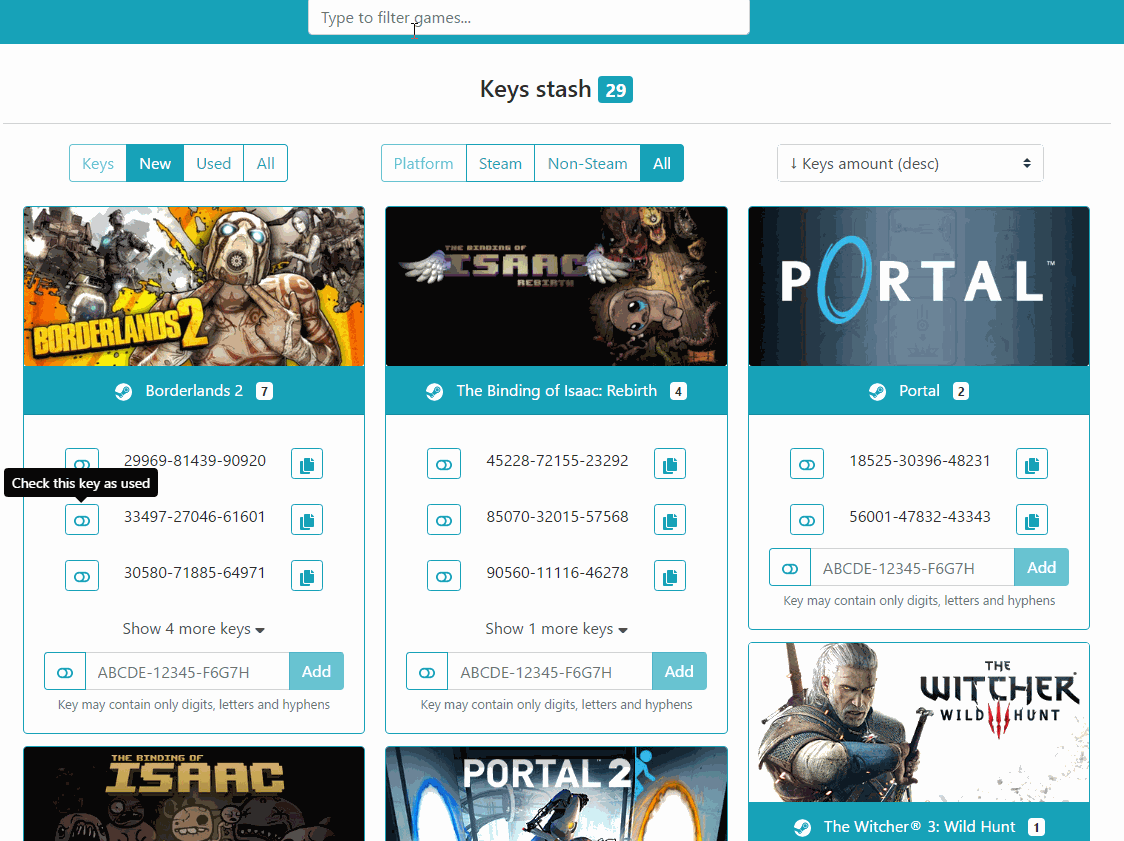 If often happens, when you get a key for a game you already have or you just want to put a key on a hold for a while. Firstly you may choose a simple notepad for that, but it becomes too messed up and complicated over time. Here is our turn! This web app allows you easily manage your virtual stash of games and keys. You have access to all Steam games from it store to quickly add them to your stash and begin earning keys.