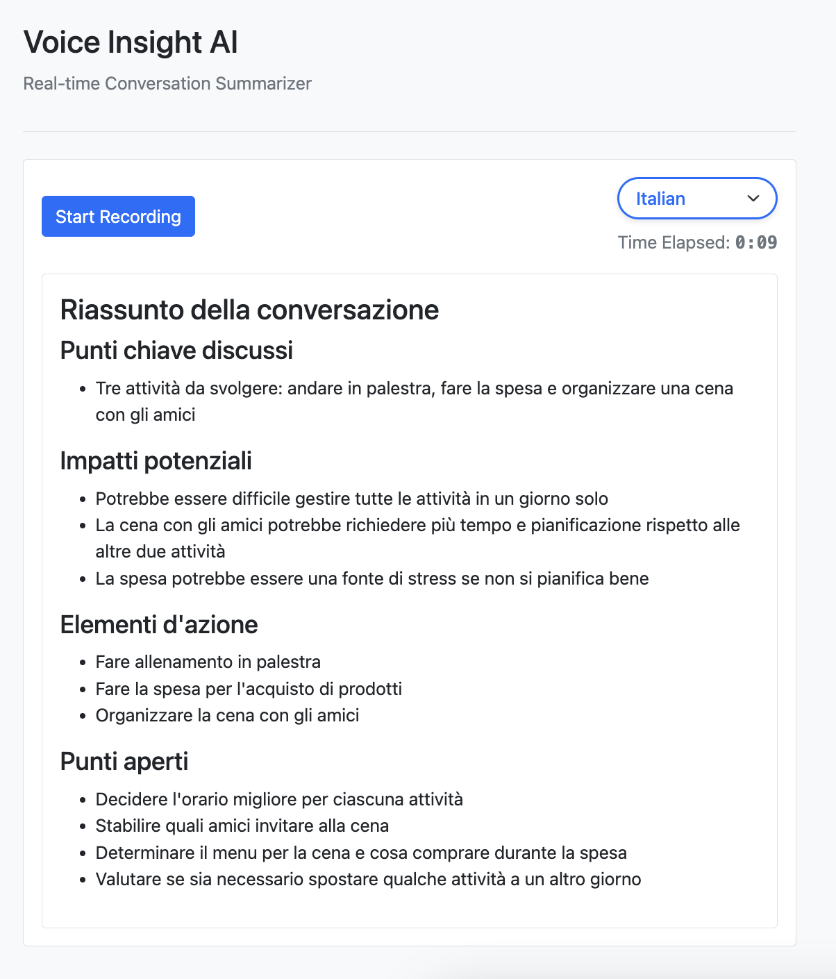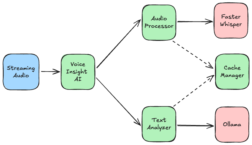 Voice Insight AI is a web application that records audio conversations, transcribes them using faster-whisper (via OpenAI) and generates summaries with key points, potential impacts, action items, and open points using Ollama. It supports both English and Italian languages and is compatible with Python 3.12. The application implements advanced caching mechanisms for both Ollama and OpenAI clients, as well as various Whisper optimizations for improved transcription performance.