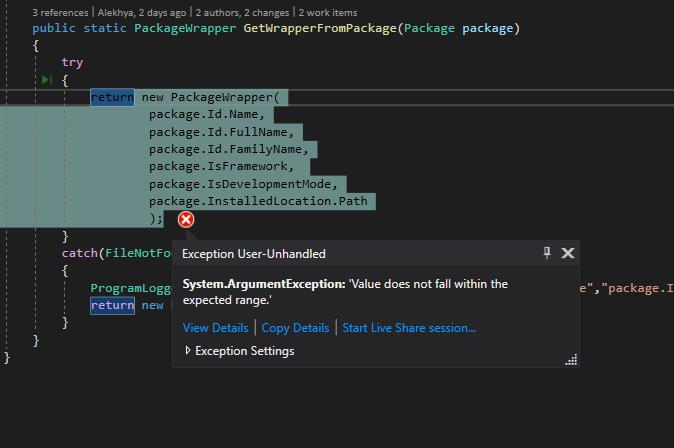 Argument Exceptionwas being thrown when whenpackage.InstalledLocation.Pathwas being accessed. It threw a value is not found in the expected range exception.ArgumentNullExceptionorArgumentOutOfRangeExceptionso other than catching the exception, no other check could be performed.deny_writeSTGM constant which prevented any other process from modifying it. This was causing all the appxmanifest.xml files to be locked by PowerToys run. Changing it todeny_nonefixed this issue. Ref - https://docs.microsoft.com/en-us/windows/win32/stg/stgm-constants. We will not face an issue where we would try to read an incompletely installed packaged app because we proceed only if the installation is complete (using args.IsComplete).Validation Steps Performed