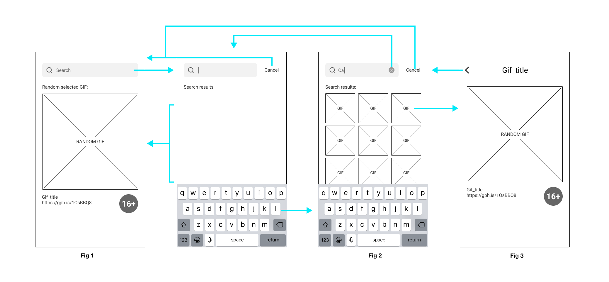 - The returning results should be displayed as shown in Fig 2. The GIFs’ in the search results do not have to be animated, and the list doesn’t have to include infinite scrolling.