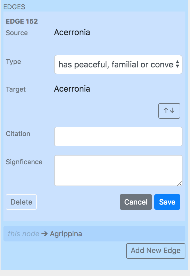 Solution 1) would mean the edit button is always shown for both the source and target. While solution 1) might work, the problem is that after change the source or target that matches the parent node, while your edge will still appear in the list of edges related to the currently selected node, it technically shouldn't be in that list anymore because it is no longer related to the parent node. We could refresh the list, but then the edge you edited would disappear, which is also odd behavior. It will be removed from the list once you navigate away. So while it's not technically correct to leave it there, it might be an adequate UX solution.