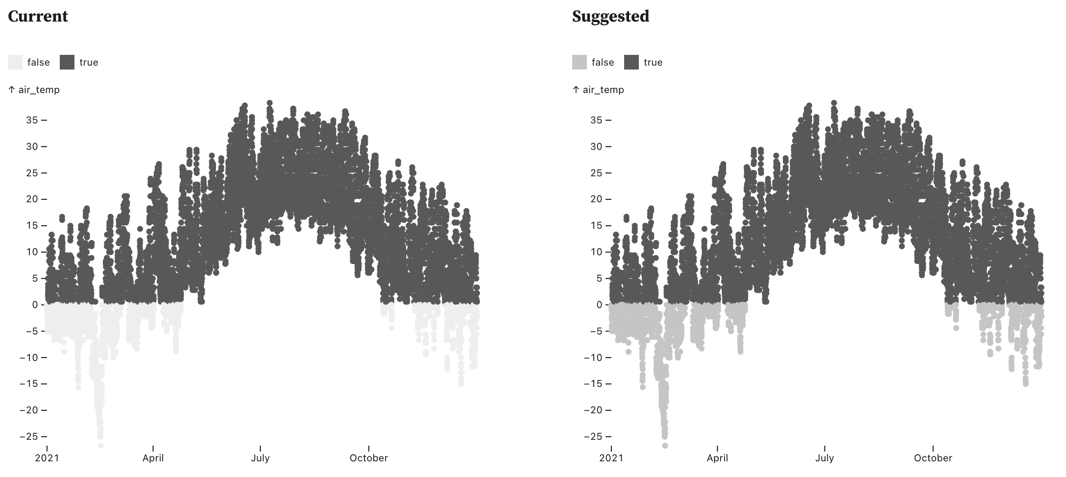 Just curious about the motivation for the switch from: The most important goal (to me) was to avoid the lightest end of the spectrum, which is now solved for*. But, sometimes the dark end is pretty dark too. So, when we were testing things, I thought that [5][1] / [5][3] was a nice balance between getting a lot of intensity difference between the two boolean colors while also avoiding the darkest darks and lightest lights. All in all, I'm super happy with this change and am 100% fine leaving it as That said, I am curious to understand why you prefered [3][1]/[3][2] to [5][1]/[5][3] :). Thank you! * except the Magma / Viridis / Plasma family which go from dark-to-light by default instead of light-to-dark like "greys", etc. |
