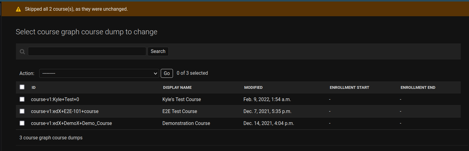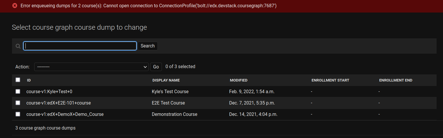 COURSEGRAPH_CONNECTIONin prod-edx-edxapp-cms, the new admin interface could be used to backfill courses into CourseGraph whenever necessary.COURSEGRAPH_DUMP_ON_COURSE_PUBLISHin prod-edx-edxapp-cms, courses would be automatically & continuously pushed to CourseGraph upon publish.Together, these changes would allow edX to decommission their CourseGraph Jenkins jobs.