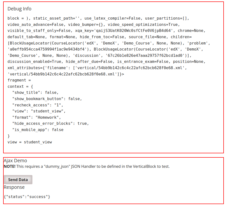 lms/envs/private.pyand include the following contentsclass VerticalBlockto test the AJAX Calls.make lms-restartNow when any unit is opened in the LMS, the bottom should have 2 red boxeslike the one below (only 1 if the AJAX Button Block was skipped). This is injected by the pipeline steps of the the openedx_filter_demos via the