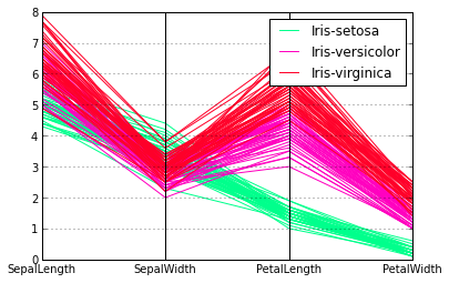 Especially in cases where the ordering of columns has significant information, the ideal way to color the series would be with a matplotlib colormap that uniformly spaces colors. This is pretty straightforward with pyplot, but pretty annoying to have to repeatedly do.