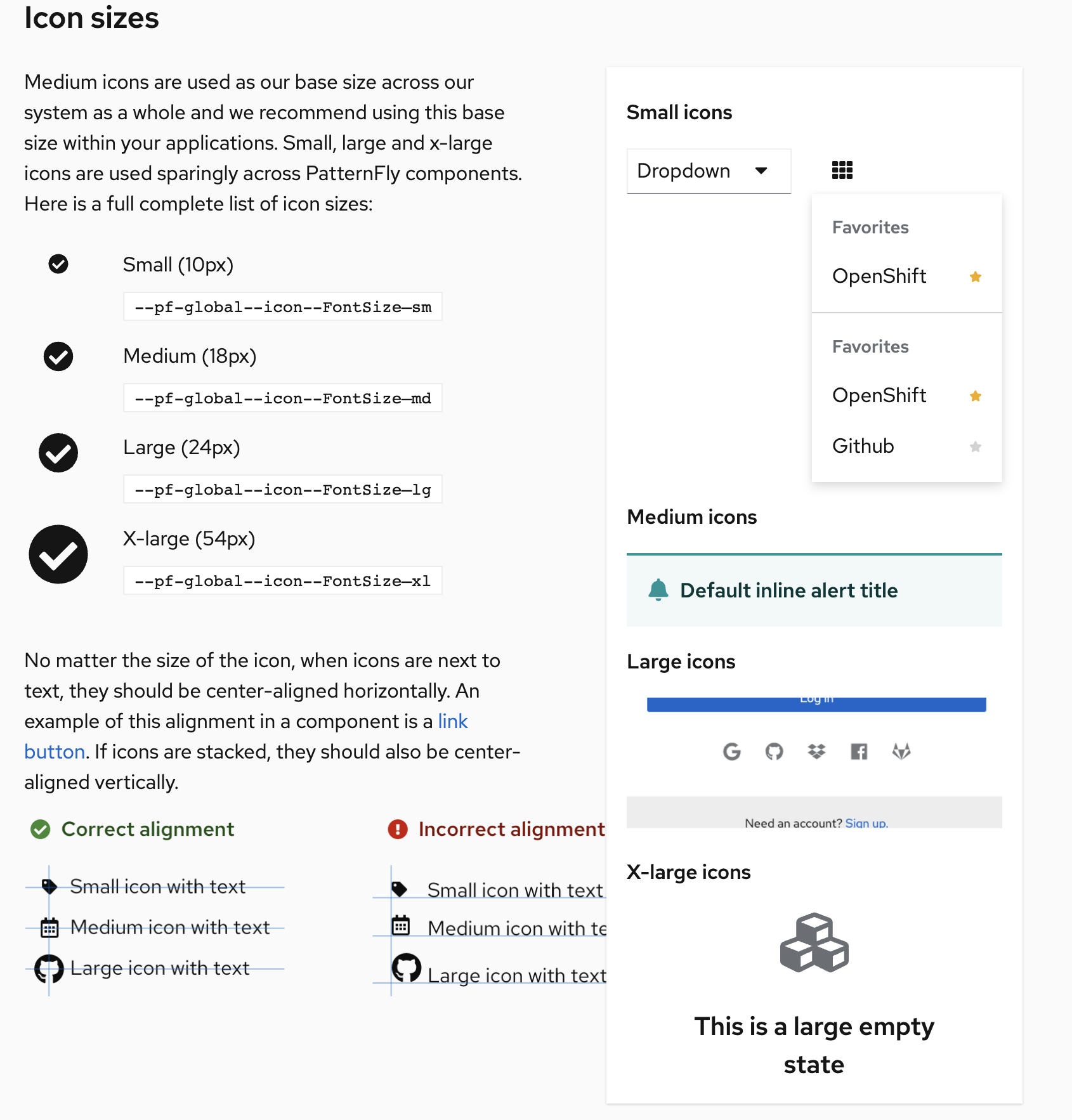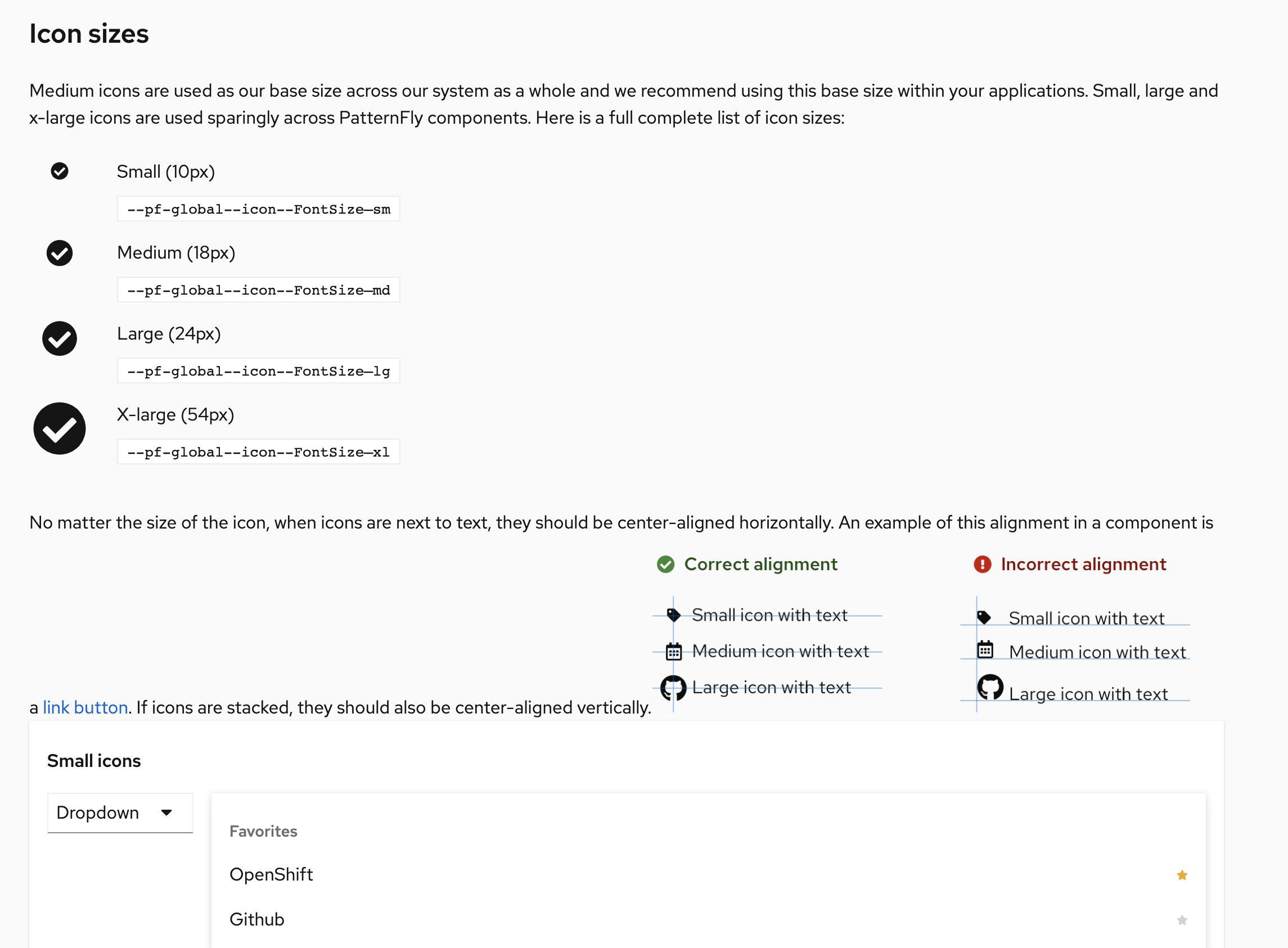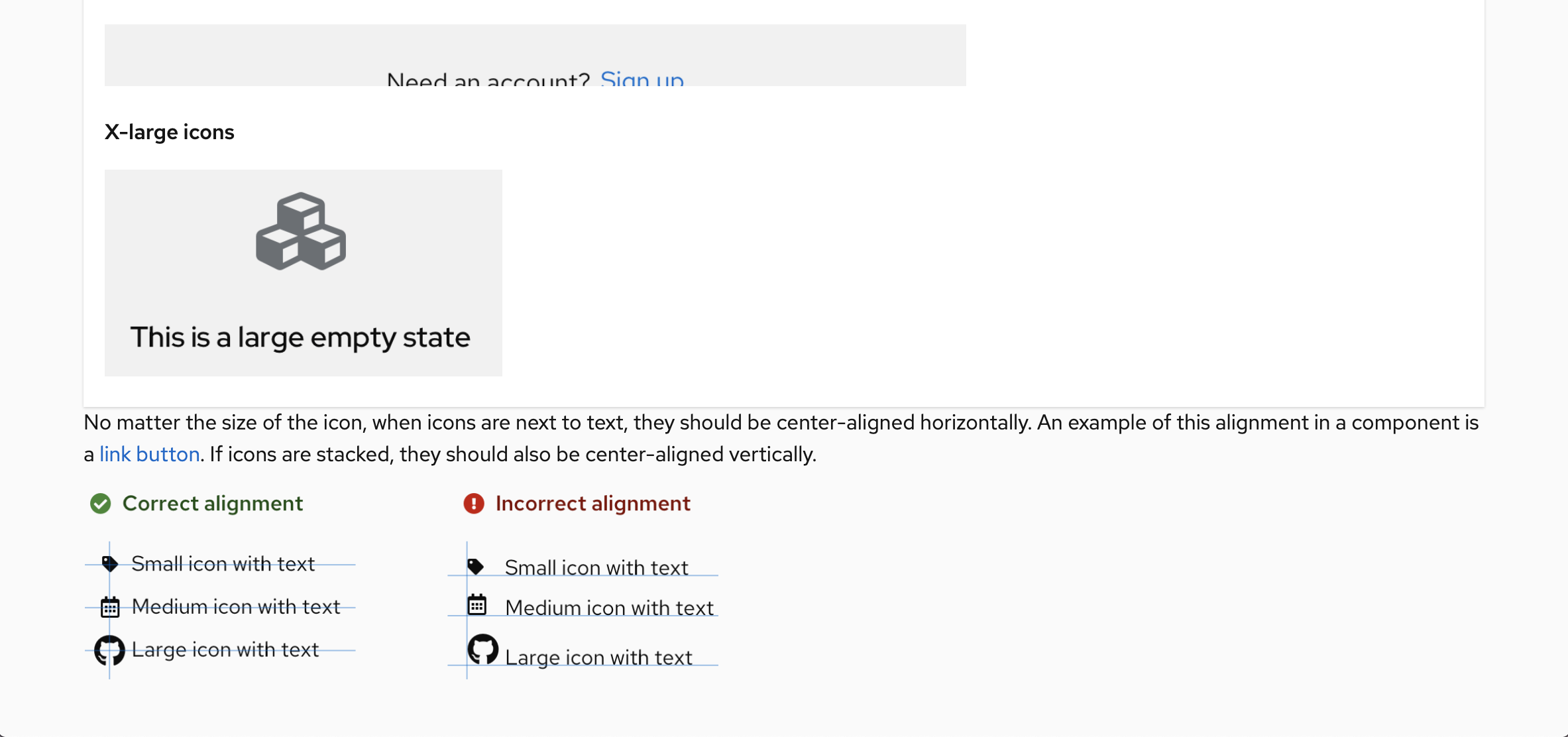 Under "small icons", the dropdown toggle example - is the down arrow supposed to be small? If so, it's 16x16. The App launcher menu beside ^ dropdown is a Under "medium icons" the alert has an Under "x-large icons" the empty state has an Also, the presentation of the small/medium/large/x-large icons box where we include these examples seems a little odd. One of the examples is a screenshot. IMO, they should all be screenshots. That would give you more control over their presentation and you won't end up with the problem of those examples having invalid markup for their role on the page. Here's what it looks like when the nav is hidden, since they're regular html/css and are responsive. It also shows how we need some space between the alignment screenshot and this example box. And here is the screen right before the nav is hidden, showing the small/medium/large/x-large example box overlapping the alignment image in the left column.