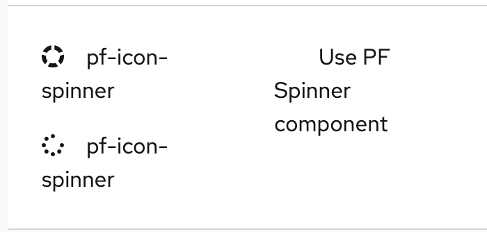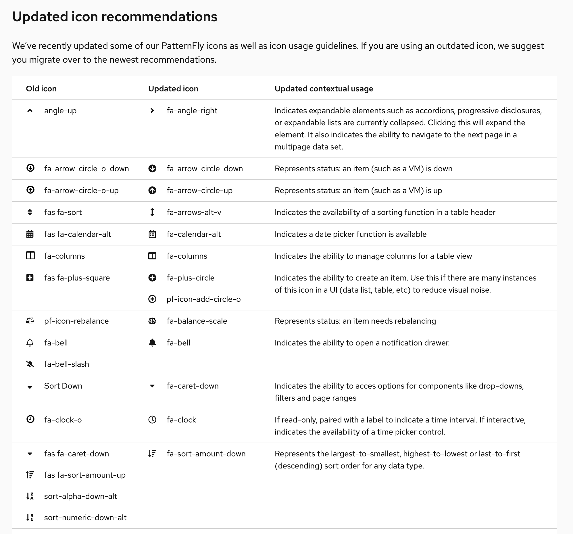 A user would have to bundle their own font-awesome regular package for this to work since we only ship the font-awesome solid webfont. Is that noted anywhere? In the "Updated icon recommendations" table, the way the names wrap is kinda hard to read. It also doesn't present the same as the "all icons" table above it. If we kept the icon/name cells from wrapping and made it a compact table, I think it would work a lot better. Old:New: |