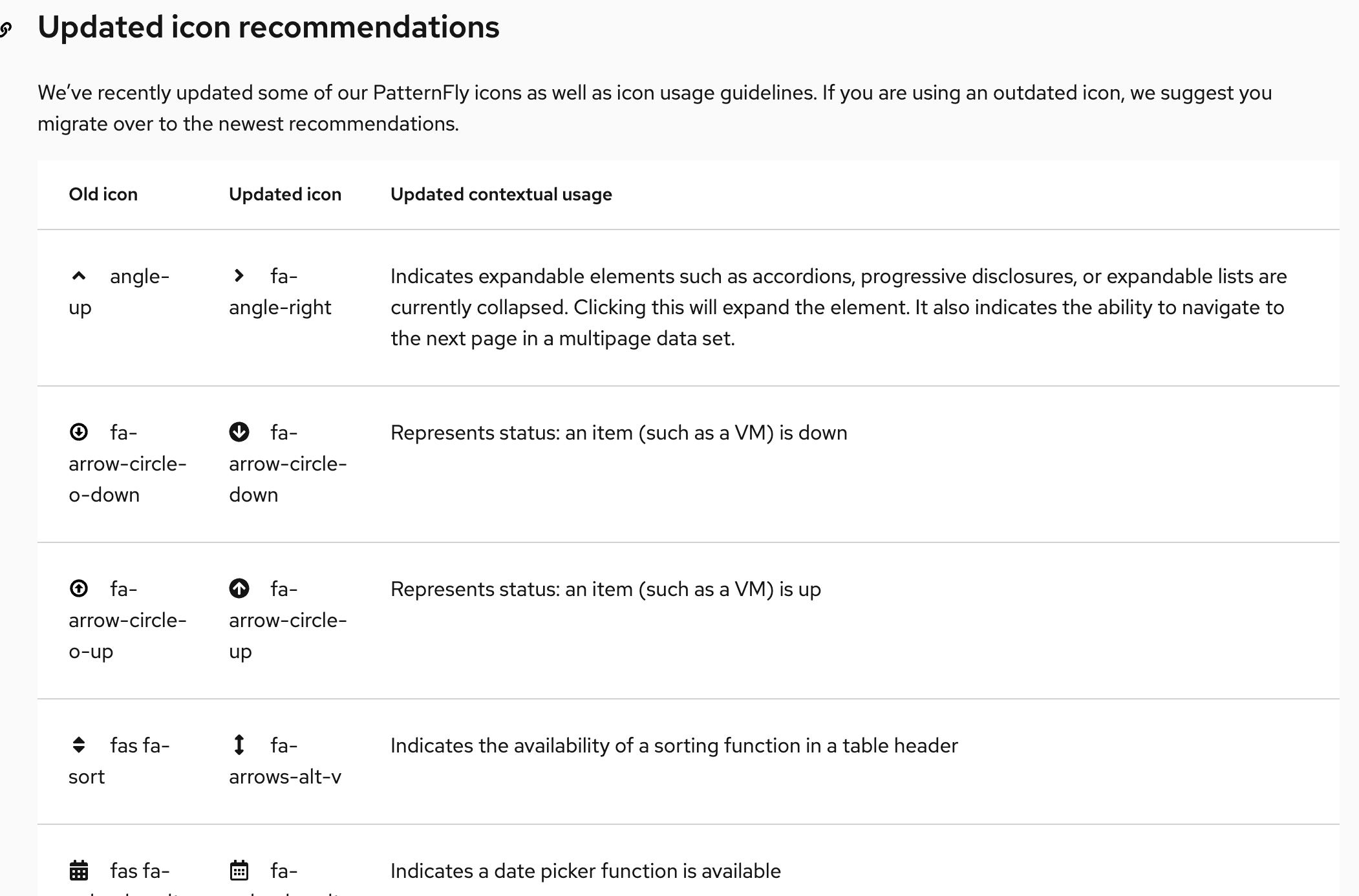 Everything @mcoker said above covers anything else I was seeing with the table! @mcoker To answer your question about the fa regular icons - we provide a link back to this page: https://www.patternfly.org/v4/get-started/developers#using-styles for that. We need to add some more text there for: