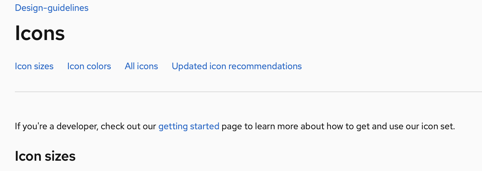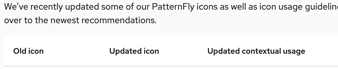 The page is looking great! I have some feedback: In the intro text for the icon table, we should link directly to the FA Free filtered set, since that's the only subset of Font Awesome we can use. https://fontawesome.com/icons?d=gallery&m=free "PatternFly uses custom icons and selections from Font Awesome Free. PatternFly icons are mostly two dimensional and flat. Navigate to Font Awesome’s website to download SVGs of any additional ‘fa’ icons within their free set. Proper attribution should be given as outlined on the Font Awesome site. Click on any single icon in the table to download it as an SVG. Download all icon SVGs here."