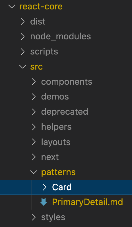 patternsfolders and fill them as needed.Core repocreate a newpatternsdirectory and move any relevant files out ofdemosand intopatterns.React repocreate new "patterns" directory and move relevant files out ofdemosintopatterns..mdfiles to includesection: patternspatternsdirectory:sourceMD(path.join(coreDocsPath, '!(demos|patterns)/**/examples/**/*.md'), 'html', coreDocsIgnore);patternsdirectory and put them within an "HTML demos" tab:sourceMD(path.join(coreDocsPath, 'patterns/**/*.md'), 'html-demos', coreDocsIgnore);patternsdirectory and put them within an "React demos" tab:sourceMD(path.join(reactCorePath, '/patterns/**/*.md'), 'react-demos');