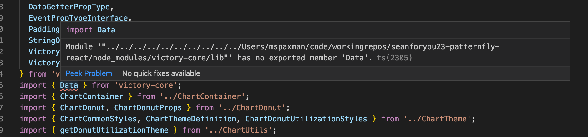 I see, thanks for explaining. I knew it would be a potentially challenging thing to achieve. It does raise good discussion though. If the incoming Victory types don't work out of box in strict mode, seems like we have the options of either continuing to expose these props as-is and for PF to not support this specific strict mode for chart components, or adjust our types as necessary and possibly reduce our support of the Victory props to the subset that we feel is worth supporting and relevant to PF needs.