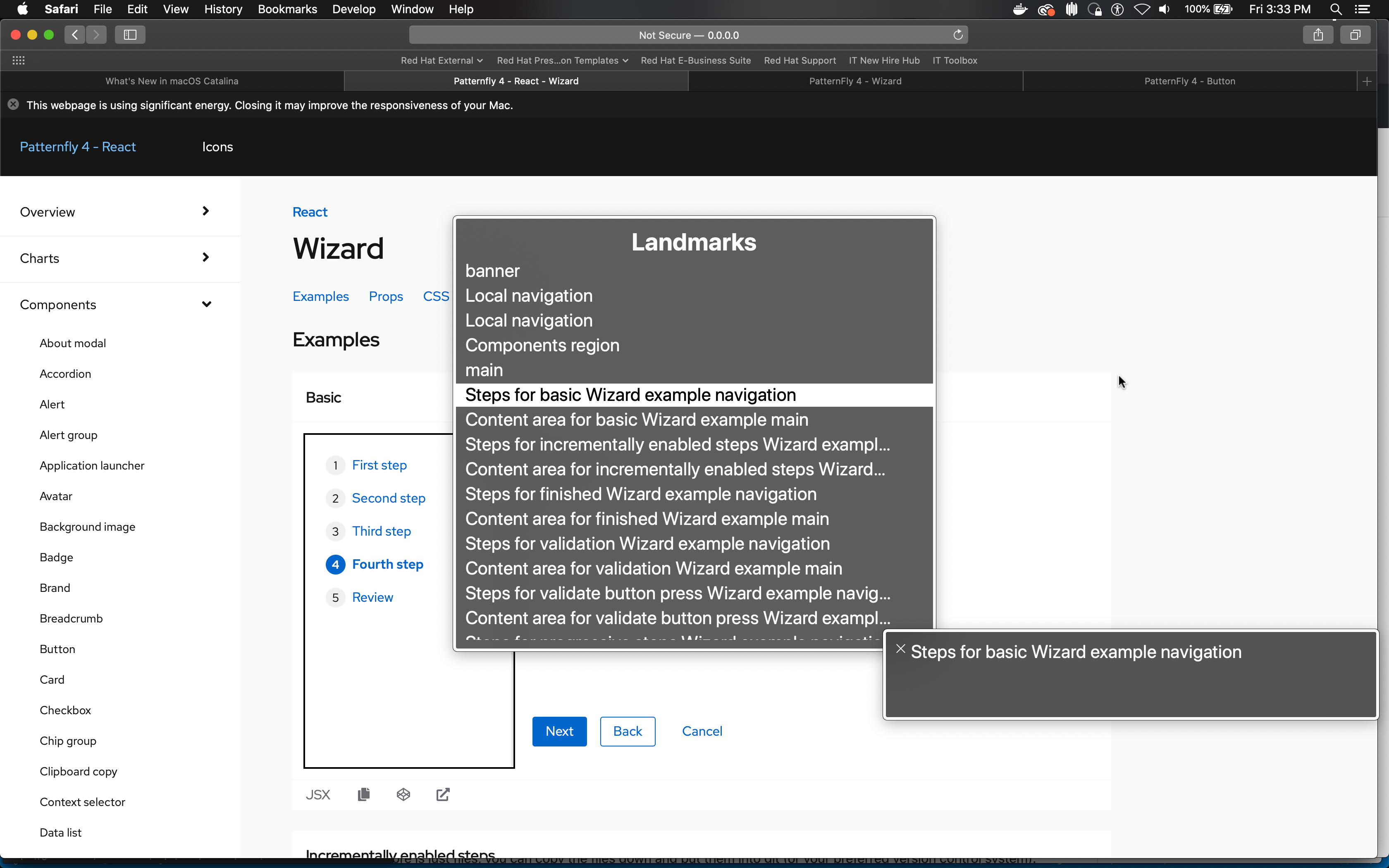 Alright, have another round of updates ready! Added some examples so both cases are clearer. I re-swizzled the way the labels are applied to use aria-labelledby approach, it's working quite well but I later realized a newer requirement for the in-page wizard not to have a header so for in-page wiz there's nothing to point aria-labelledby to out of the box. For these examples, I added the bare example title as aria-label to the We should now be able to override all these new props and I've done some cleanup to ensure we're not adding aria attributes in cases where none are needed. The reason the links were not showing up to screen reader users was because they didn't have href, so for these cases we now throw an error to help prevent users from making this mistake. I noticed the button in WizardToggle renders to the DOM for the in-page wizard, it's just hidden in the background.. is it used for anything? If not I may add a small check to remove it from the DOM for housekeeping sake. |