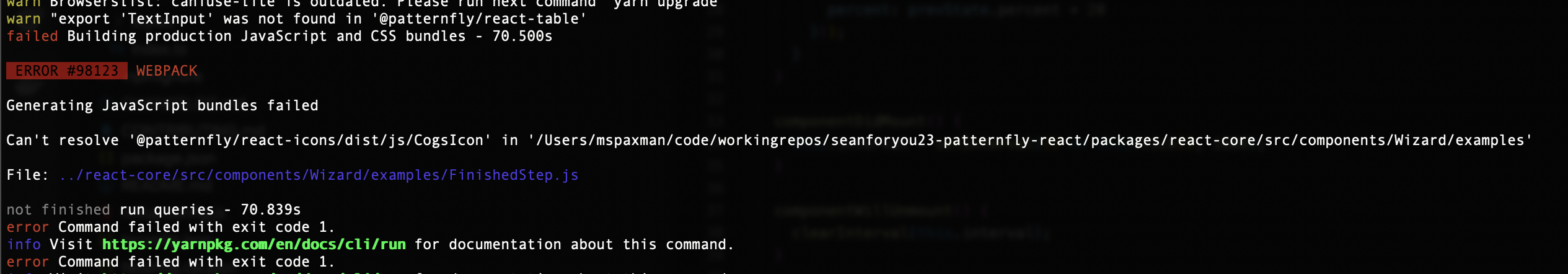 @jschuler good catches, fixed up the emtpy state bits in the finished step example, I guess they've been out of date for a while now. Regarding the expanded class, I updated it to use dynamic style property from react-styles, but then noticed it's never applied because isOpen is always false. Does this need to be cleaned up? The last thing was that the docs build keep failing with different errors on CI vs locally. Local error attached below.. When I fix the path to something that works like |
