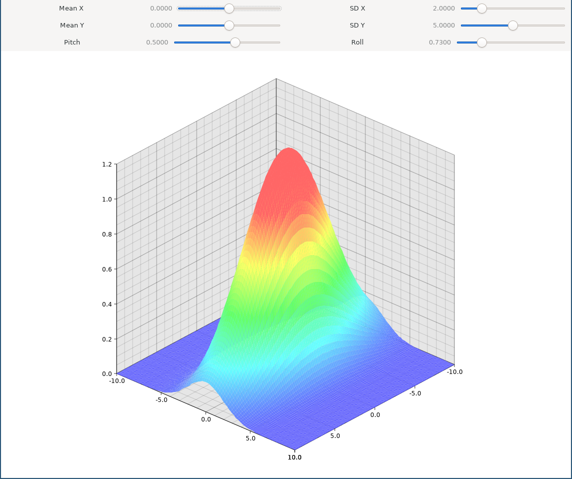 This is an example project that shows how to integrate Plotters into a GTK application. This example is a simple visualization of the PDF 2 dimensional gaussian distribution.