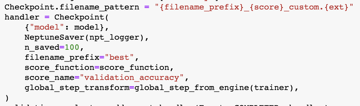 @Joel-hanson the problem of using predefined pattern like Just tried to play around all of that, I think class attribute is not a good approach... For example, I would like to setup 2 savers: training checkpoint (to save trainer, model, optimizer etc) and best model. For the first one, I do not want to alter filename pattern and for the second I provide score name and score function but for the filename instead of Maybe, we can introduce it as an additional argument to |
