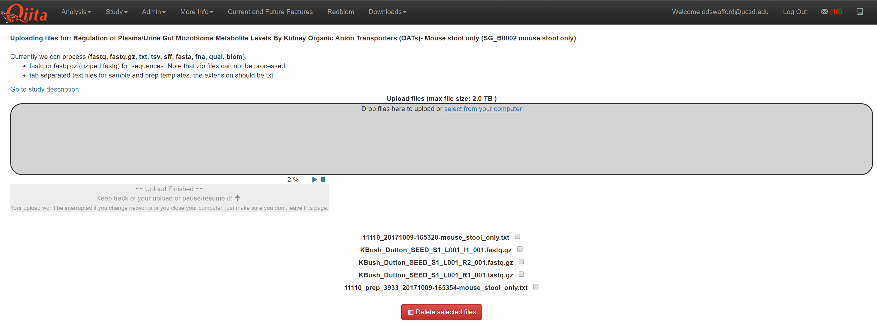 Drag and drop metadata (txt) and fastq files into Upload FIles box