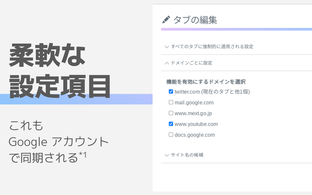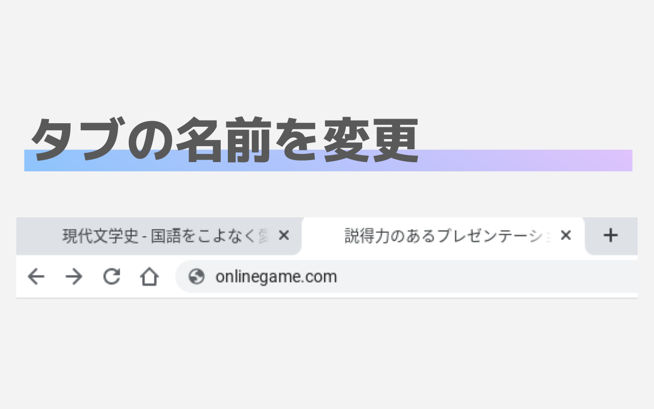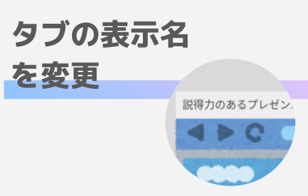 Rename Tab タブの表示名を変更できるChrome拡張機能 Chrome のタブに表示される Web サイト名を簡単に変更しよう! 簡単に紹介 プライバシーについて 本拡張機能を通じて、ユーザーの情報を収集・送信することは決してありません。 また、そのことを証明するために、このようにコードをすべて公開しています。 安心してご利用ください。 ライセンス表示 Milligram © CJ Patoilo Bootstrap Icons © 2019-2020 The Bootstrap Authors