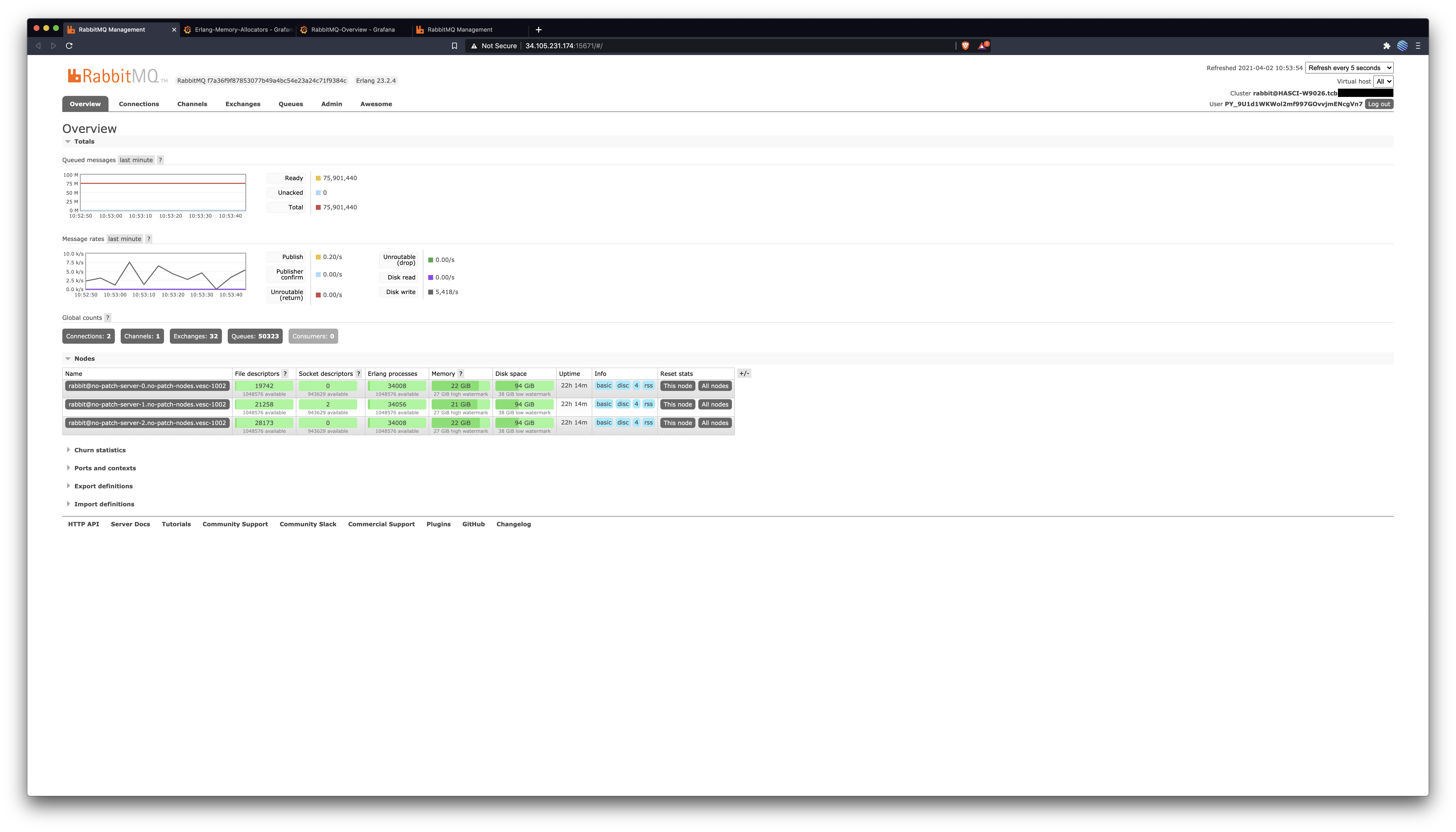 Test setupWe used the #2785 workload as the starting point. Erlang 23.2.4 was built via the recently introduced OCI GitHub Action and we deployed on GKE with Cluster Operator. Expand the attached K8S manifest if you're interested to see all those details: K8S rabbitmq.ymlapiVersion: v1