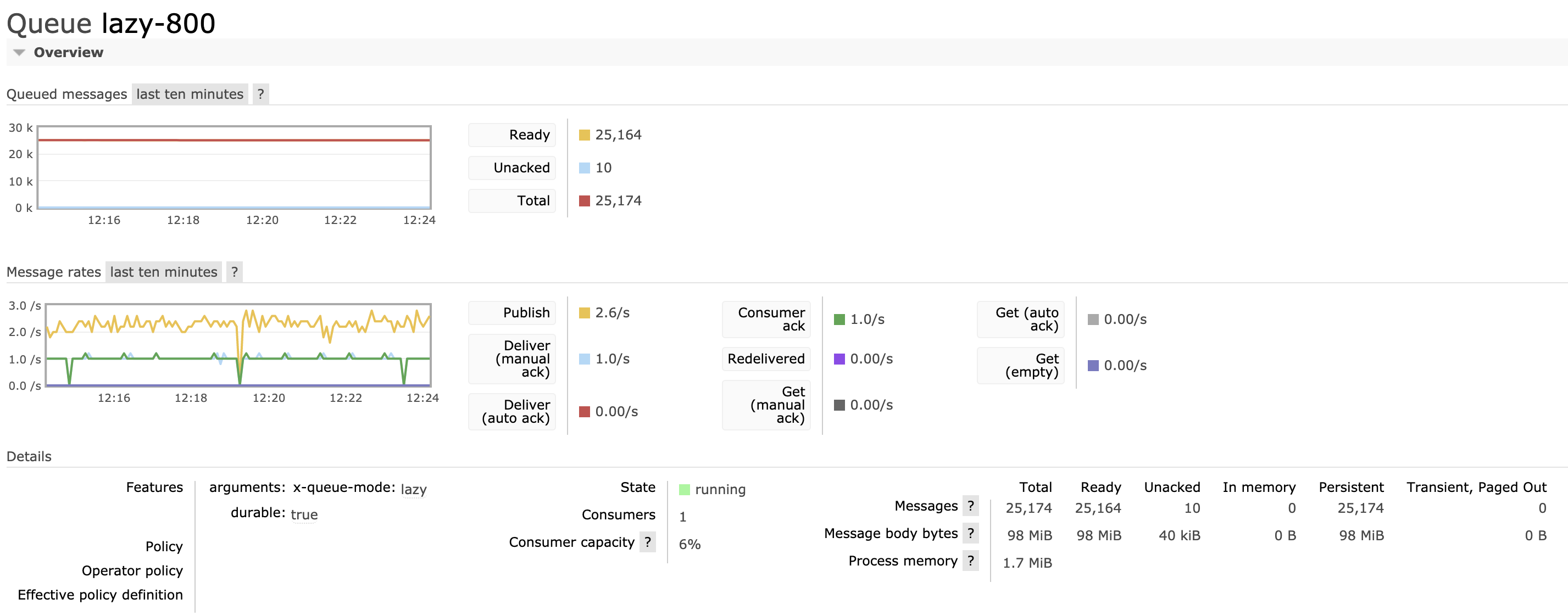 This is what the memory looks like running over the week-end with a reduced segment entry count (1024 instead of 16384): As you can see RSS is stable at 1.5G (1.2-1.4G according to management). This is with 800 lazy queues. Current RabbitMQ master would not manage with even 500 lazy queues as that would reach the There are about 20 million messages in the queues total with an expiration of 3 hours. Process memory is typically in the 1-2MB range: |