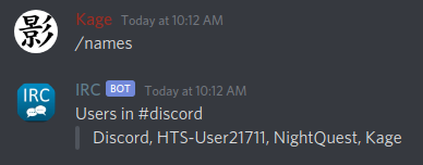 command to Discord so users there can see who is in the associated IRC channel. The command and its output are only seen in Discord and not carried over to IRC.Example output: