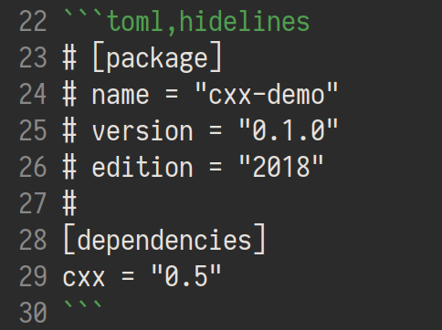 Possible future extension: ```language,hidelines=@ for hiding based on a symbol other than #.
