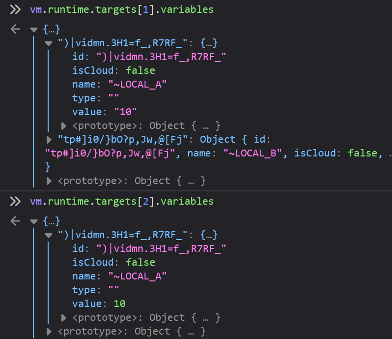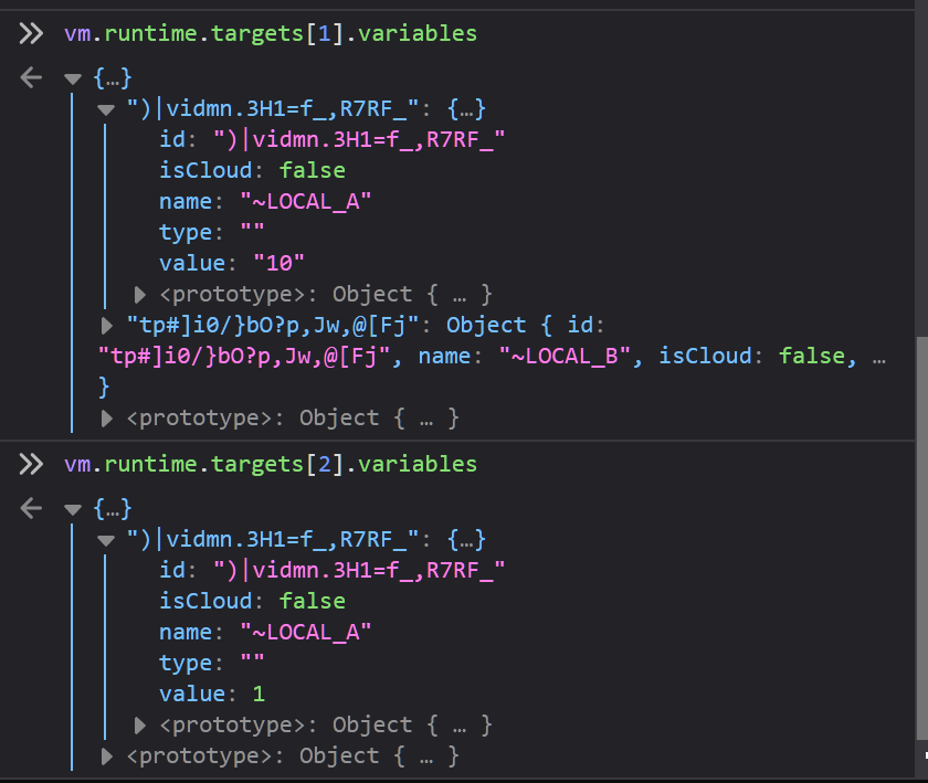 I've run vm.setVariableValue(vm.runtime.targets[2].id, ")|vidmn.3H1=f_,R7RF_", 1) to see how things will be and the result is:
