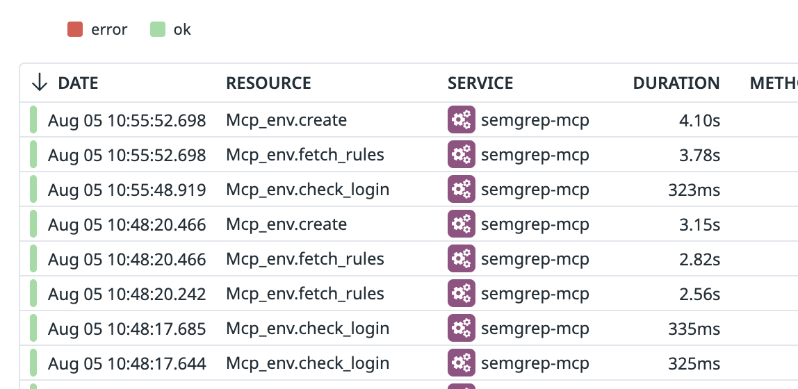 semgrep mcpimplementation. and i think it is still doable if we want to separate the spans and not nest them under one top-level span. i would just have to initialize a new trace and pass the env var in every time i make an rpc call (instead of using the same trace info). i can also update the tracing on thesemgrep mcpside to start a top-level scan per rpc call instead of per mcp process.